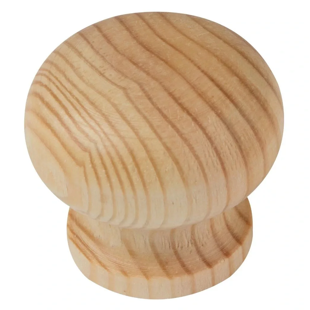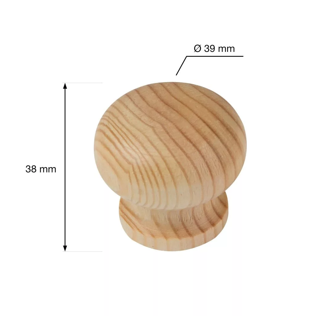 Lara fa bútorgomb lakkozott fenyőfából, 39 mm átmérőjű és 38 mm magas. A csomag tartalmaz egy rögzítőcsavart.