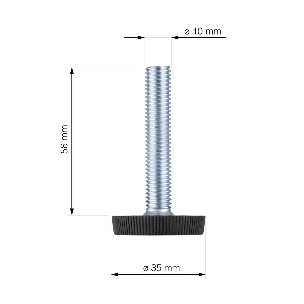35 mm átmérőjű és 56 mm magas rögzítőcsavarok, M10 menettel és fekete műanyag talppal. 2 db a csomagban.
