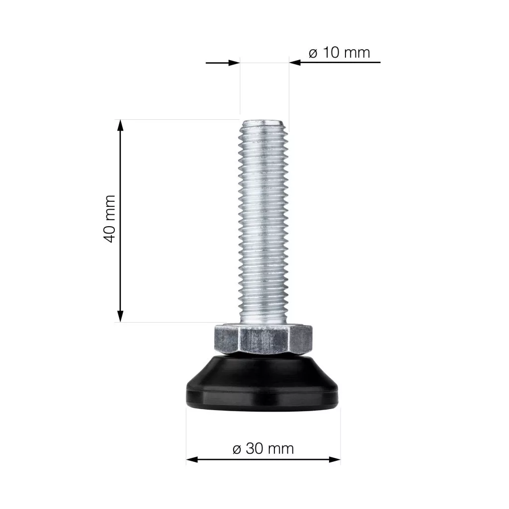 30 mm átmérőjű és 40 mm hosszú rögzítőcsavar M10 menettel és forgó műanyag talppal, fekete színben. A csomag 2 db-ot tartalmaz.