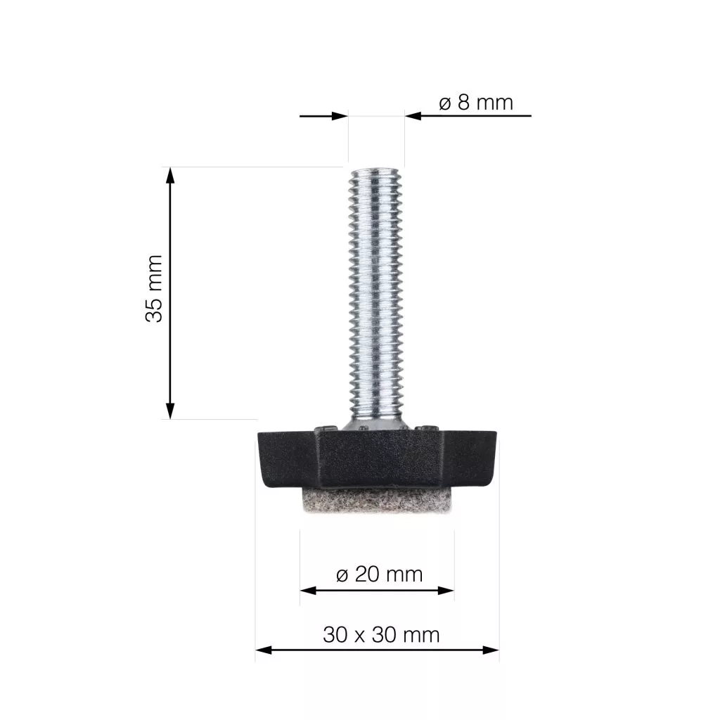 30x30 mm-es fekete talpú, 20 mm átmérőjű filc alátéttel ellátott rögzítőcsavar. A rögzítőcsavar M8-as menettel rendelkezik, magassága 35 mm. A csomag 2 darabot tartalmaz.