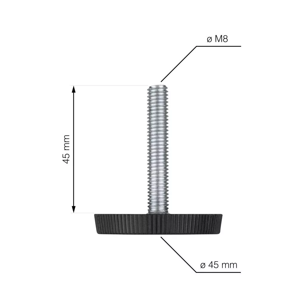 45 mm átmérőjű és 45 mm magas rögzítőcsavar, M8 menettel és műanyag talppal, fekete színben. A csomag 2 db-ot tartalmaz.