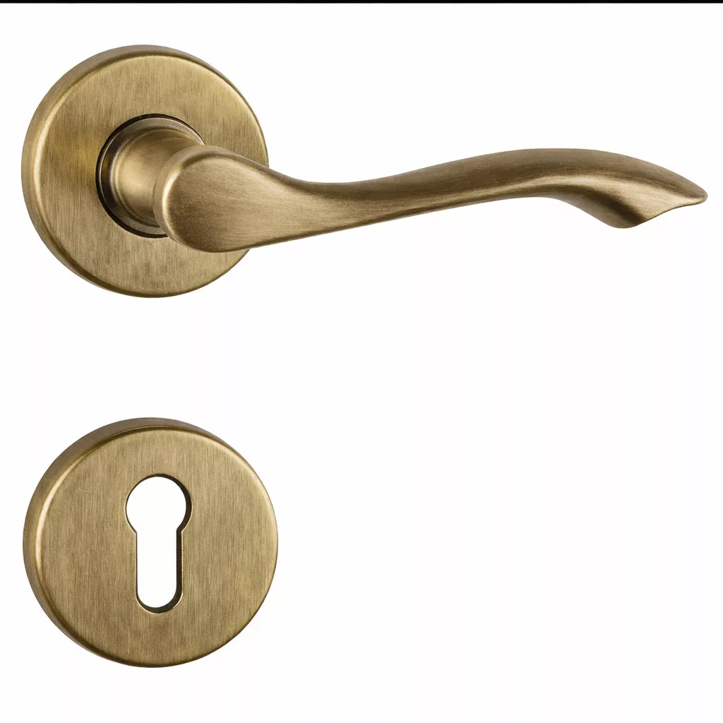 Rusztikus jellegű antikolt rozettás ajtókilincs. A modern antik vonal képviselője. Tökéletesen követi napjaink újító trendjét. Méretei: Kilincs hossz: 155mm Körrozetta átmérő: 52mm Ajtókilincs NEM RÉZ alapanyagból készül amely felülete antikolt jellege sárgás-fekete színű és lakkal védett. Rugós működtetésű kilincs. Ajtócímke rozetta átmérője: 50 mm sild magassága:11 mm Kilincsméret:115 mm. A fogantyú lágyan hajlított kézhez álló kidolgozású. Szolidan de mégis kecsesen ékesítheti ajtaját. Általános használatra rusztikus-klasszikus lakásokba kiváló választás.