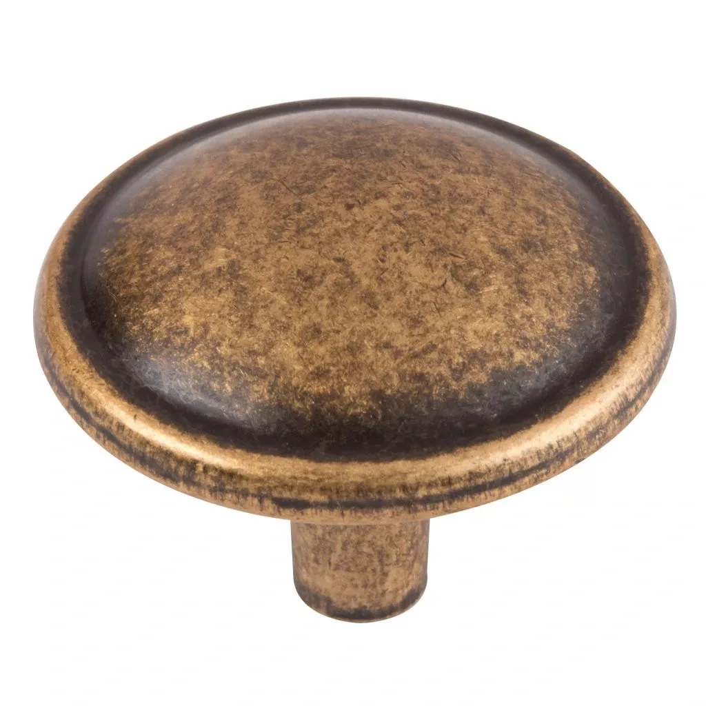 Rusztikus Mali bútorgomb patinás sárgaréz dizájnnal, 32 mm átmérőjű és 25 mm magas. Rögzítőcsavarral együtt.