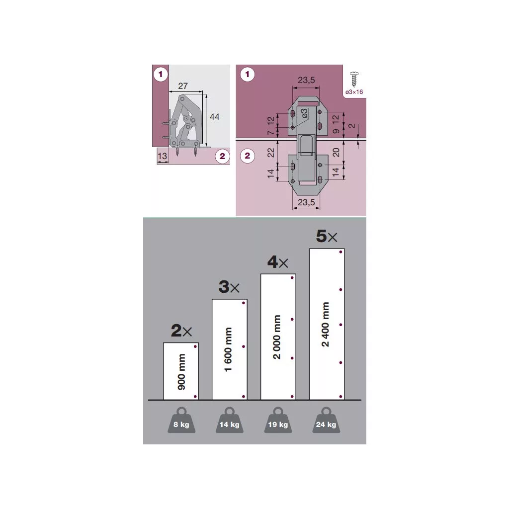 Mini zsanér 90°-os nyitási szöggel, 23,5 mm-es rasztertávolsággal és automatikus záródással. 16-19 mm vastagságú ajtókhoz alkalmas. Könnyű és gyors szerelés - csavarozással.