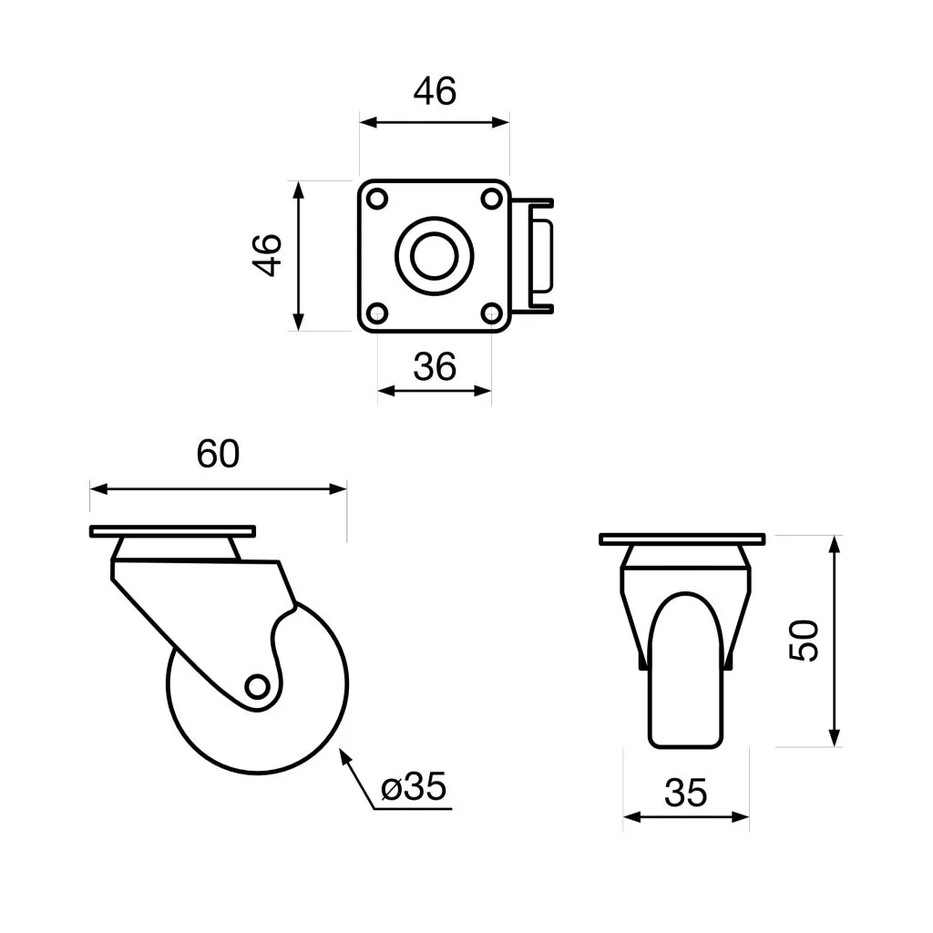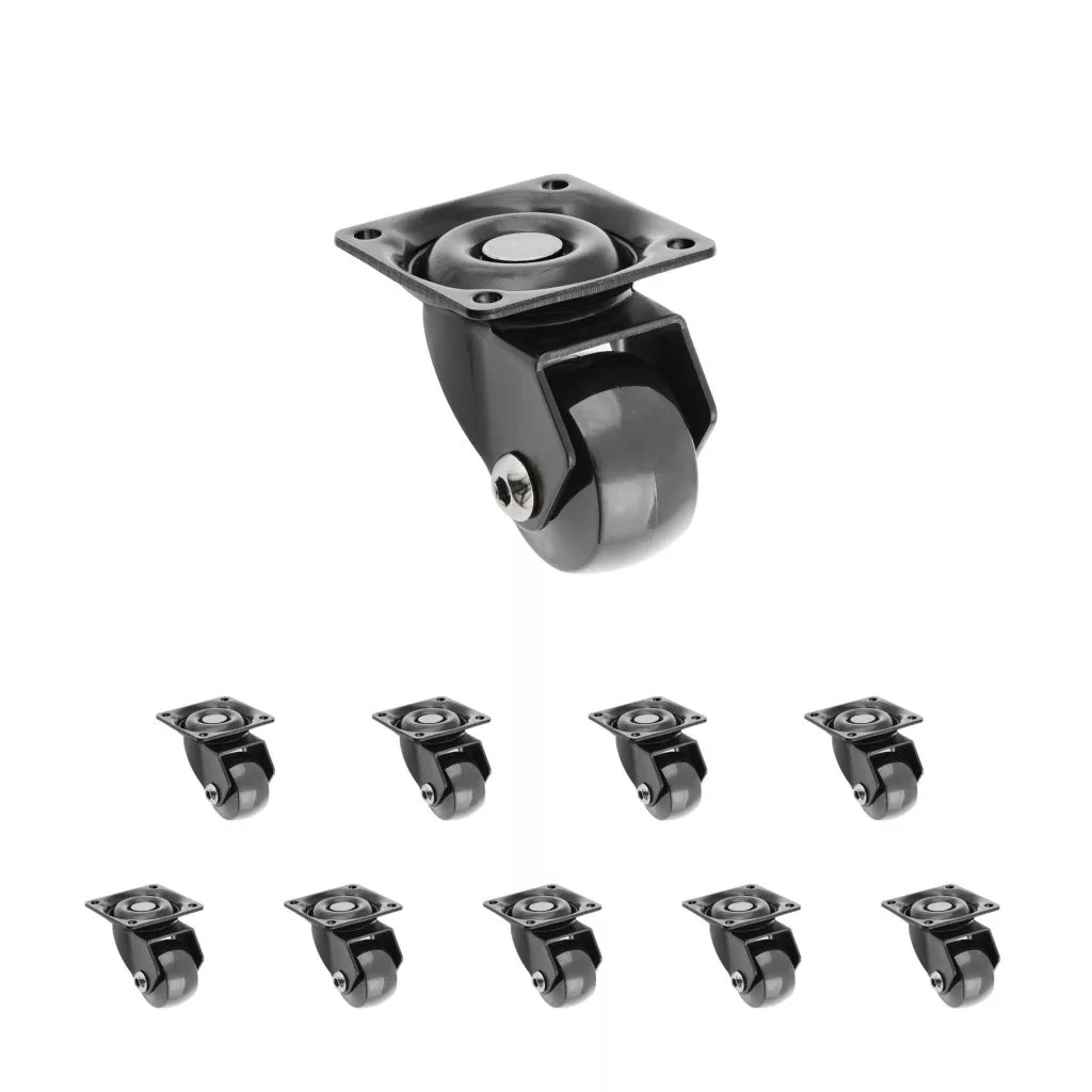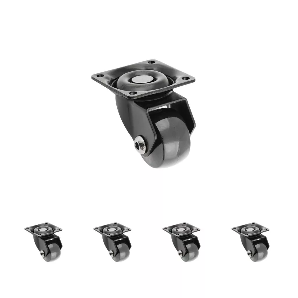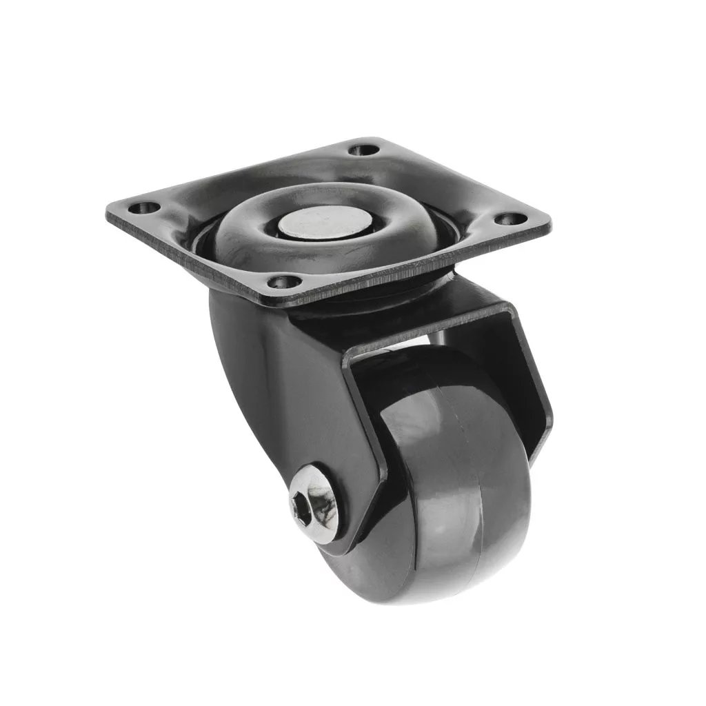 Forgatható, teljesen fekete eszközkerék, 35 mm átmérőjű, 40 kg dinamikus teherbírással. Kerékmagasság 50 mm. Puha padlókhoz tervezve.