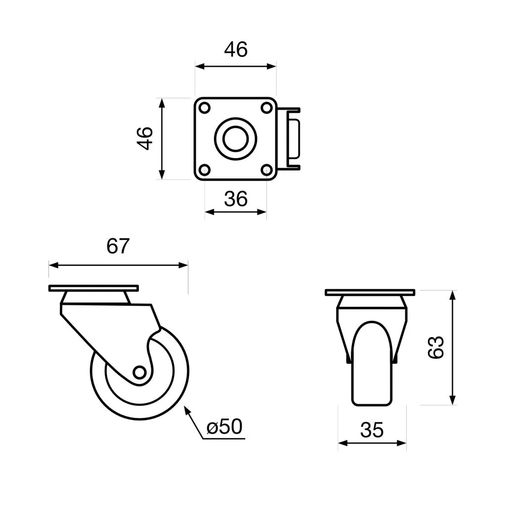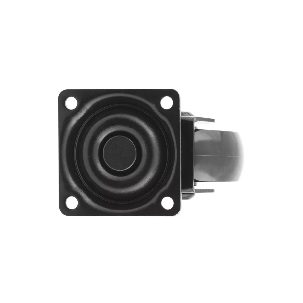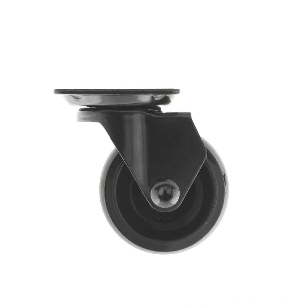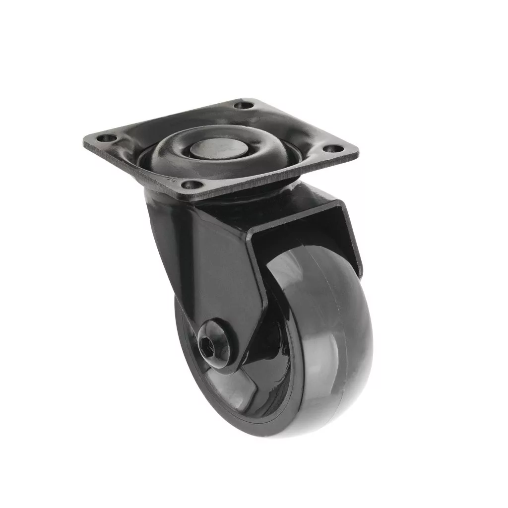 Forgatható, teljesen fekete készülékkerék, 50 mm átmérőjű, 40 kg dinamikus teherbírással. Kerékmagasság 63 mm. Puha padlóra tervezve.