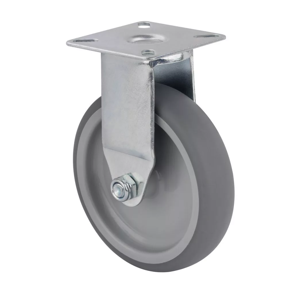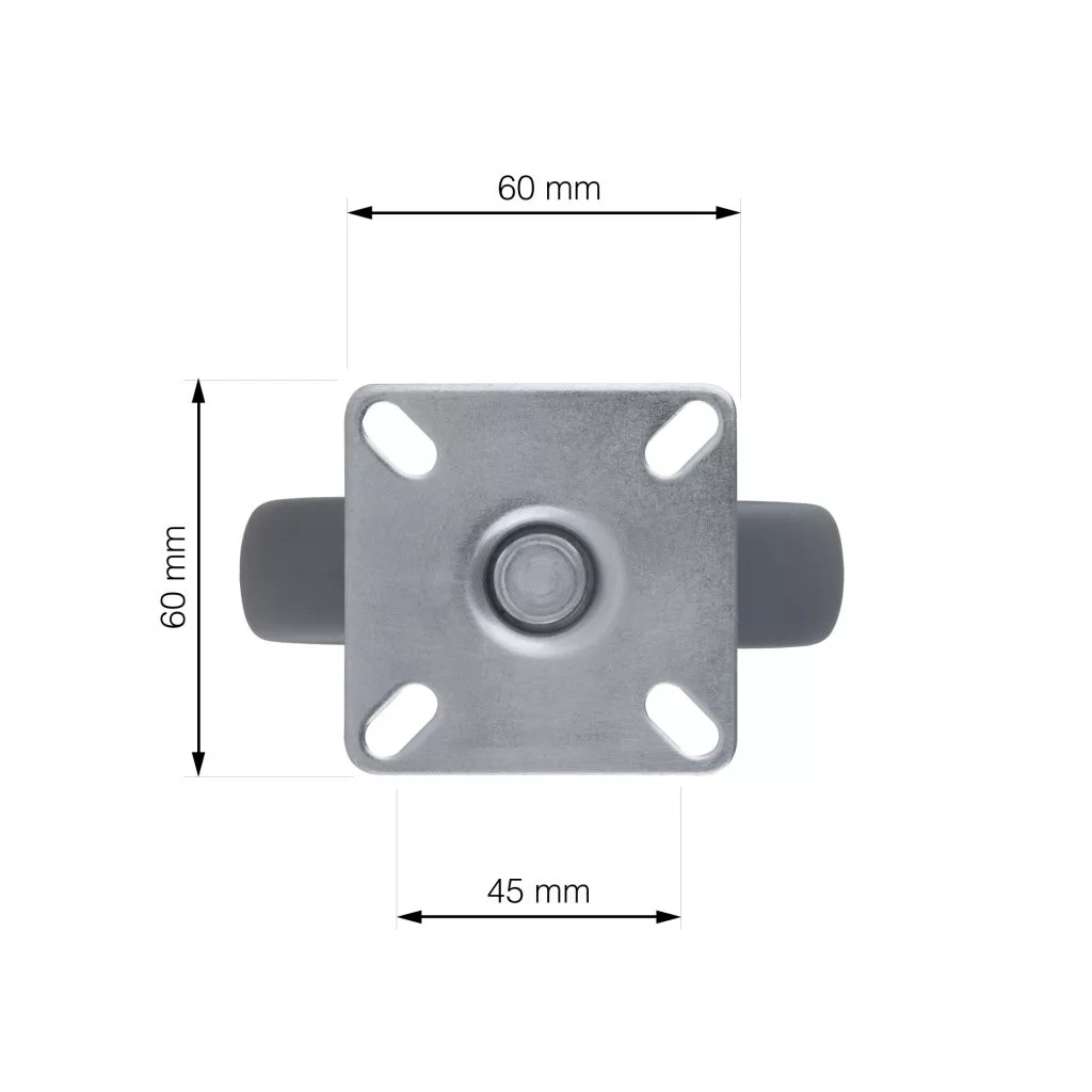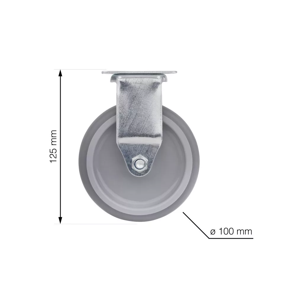 Fix készülékgörgő fékkel, átmérője 100 mm, dinamikus teherbírása 70 kg. Görgőmagasság 125 mm, talpmérete 60 x 60 mm. Puha és kemény padlóra tervezve.