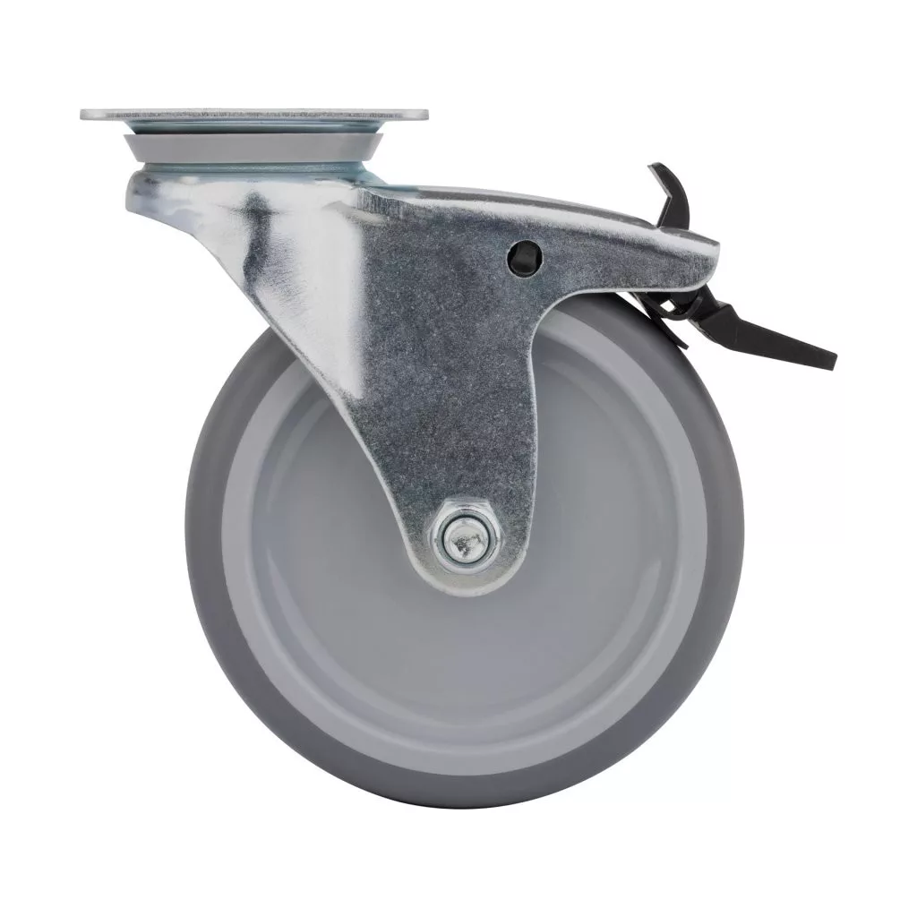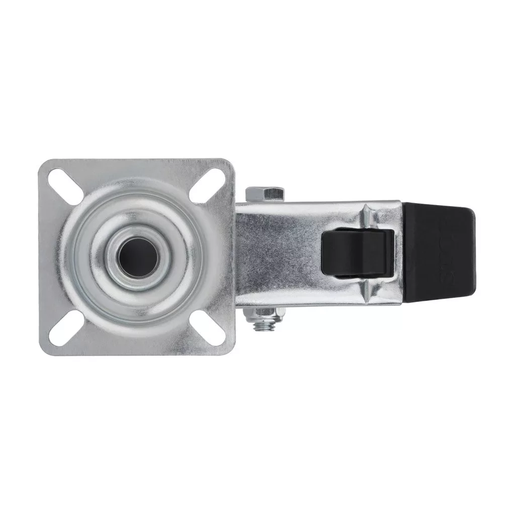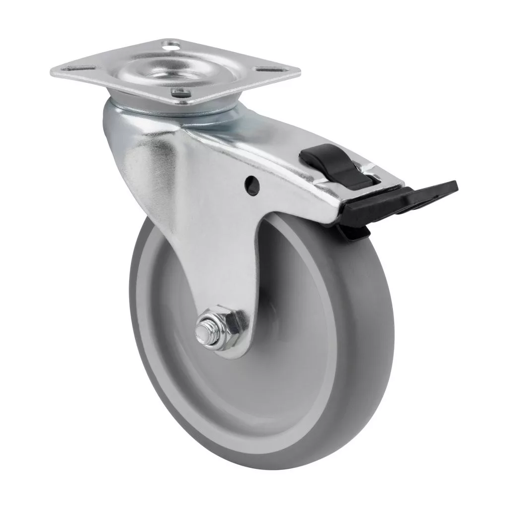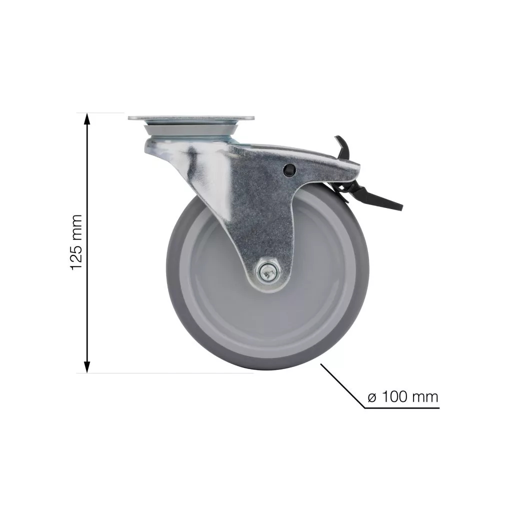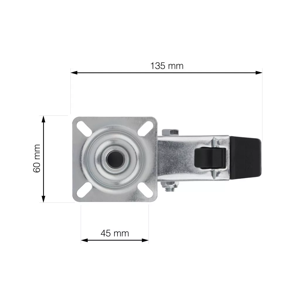 Fékezhető forgógörgő, átmérője 100 mm, dinamikus teherbírása 70 kg. Görgőmagasság 125 mm, talpmérete 60 x 60 mm. Puha és kemény padlóra tervezve.