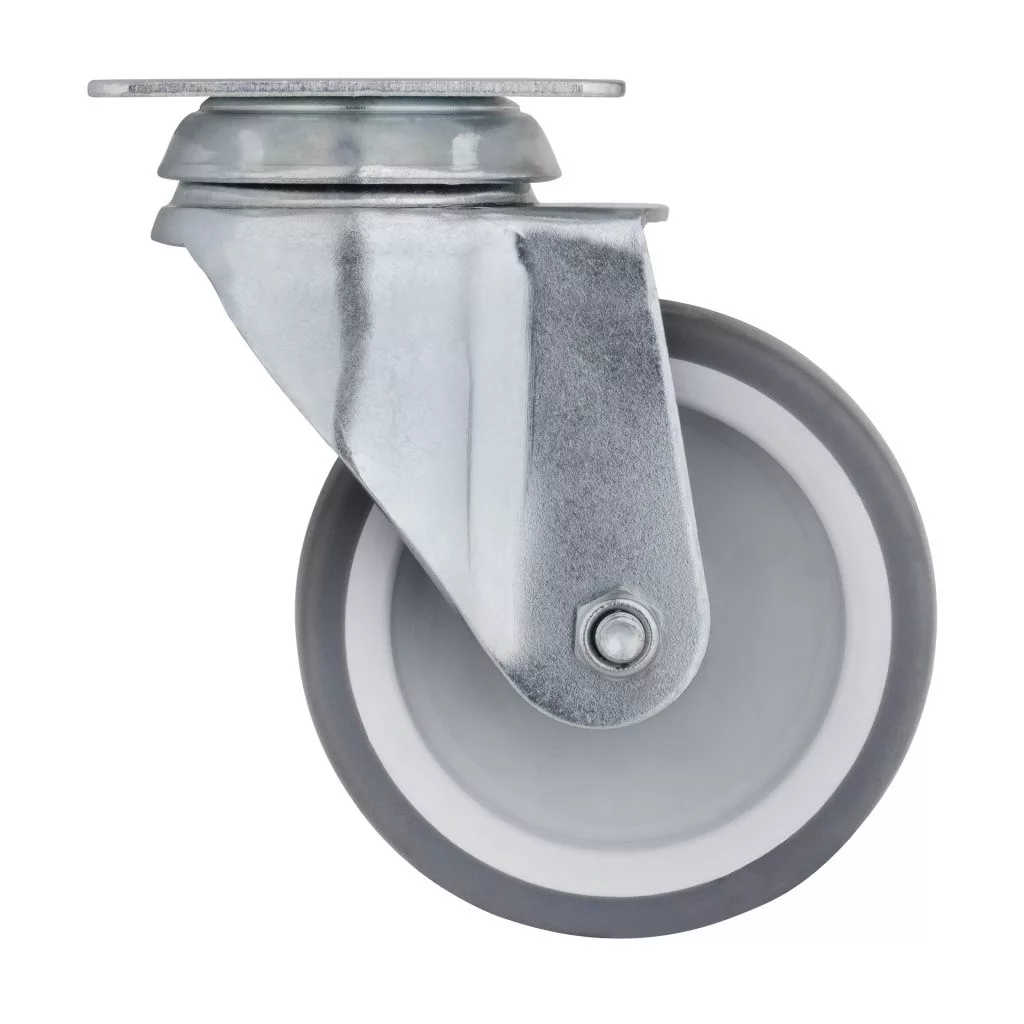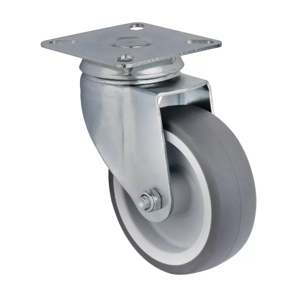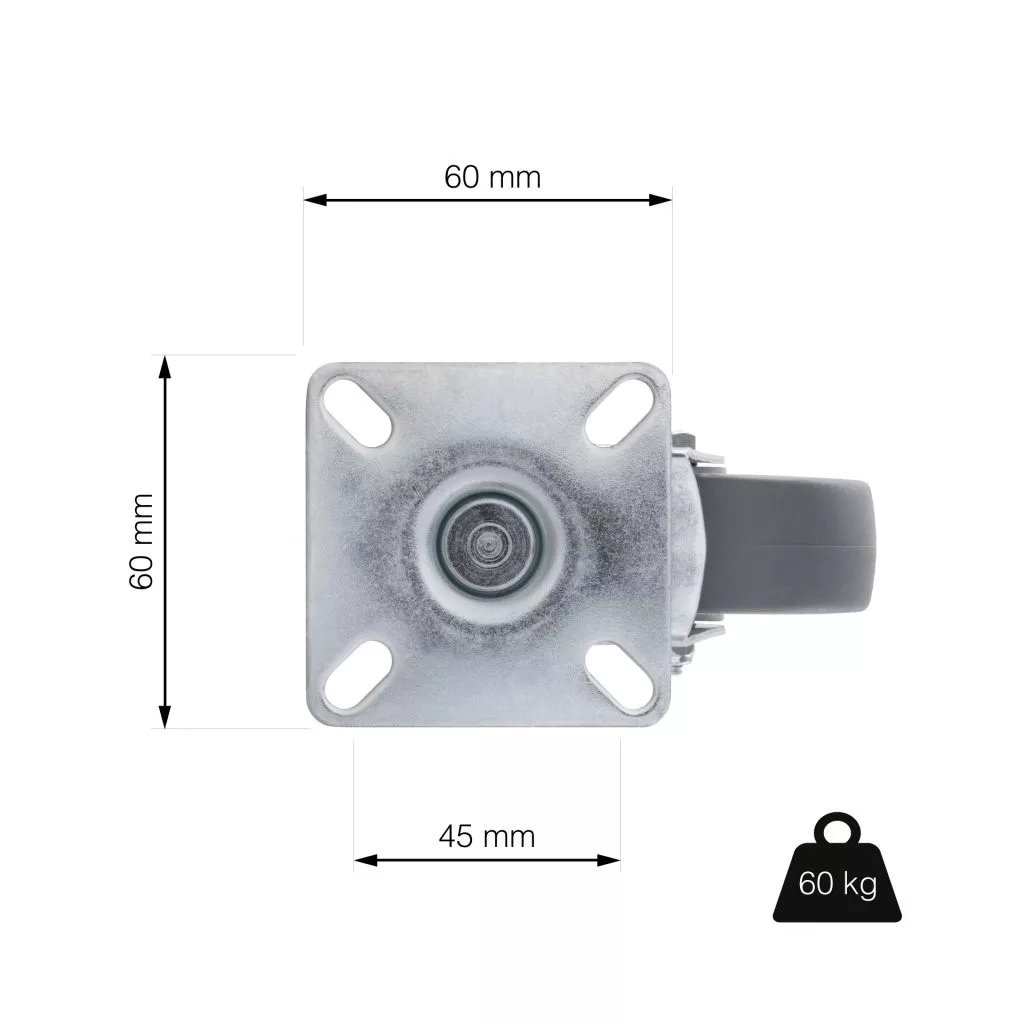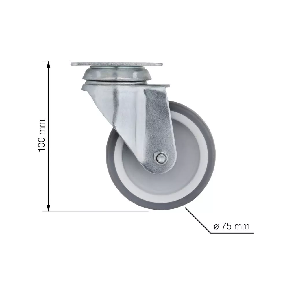 75 mm átmérőjű, 60 kg dinamikus teherbírású forgógörgő. 100 mm-es magasságú görgő, 60 x 60 mm-es talppal. Puha és kemény padlóra tervezve.
