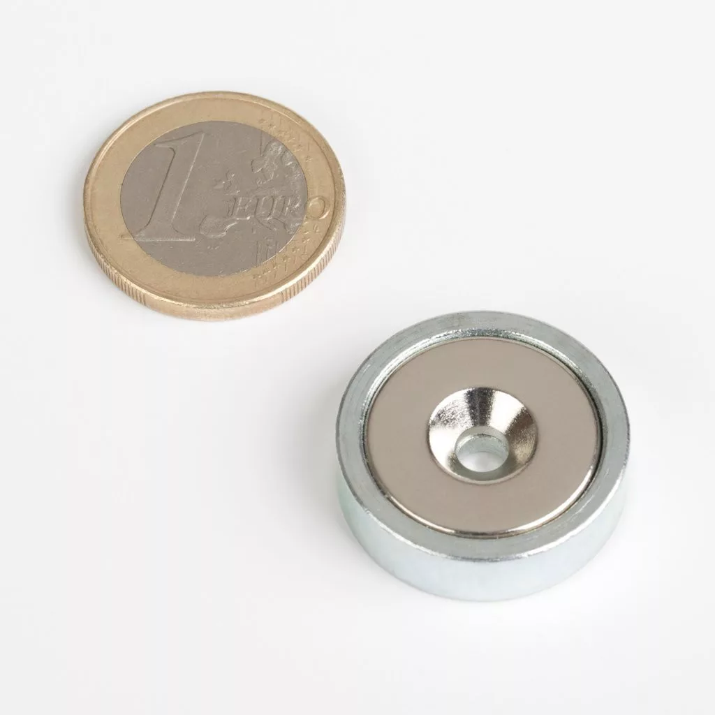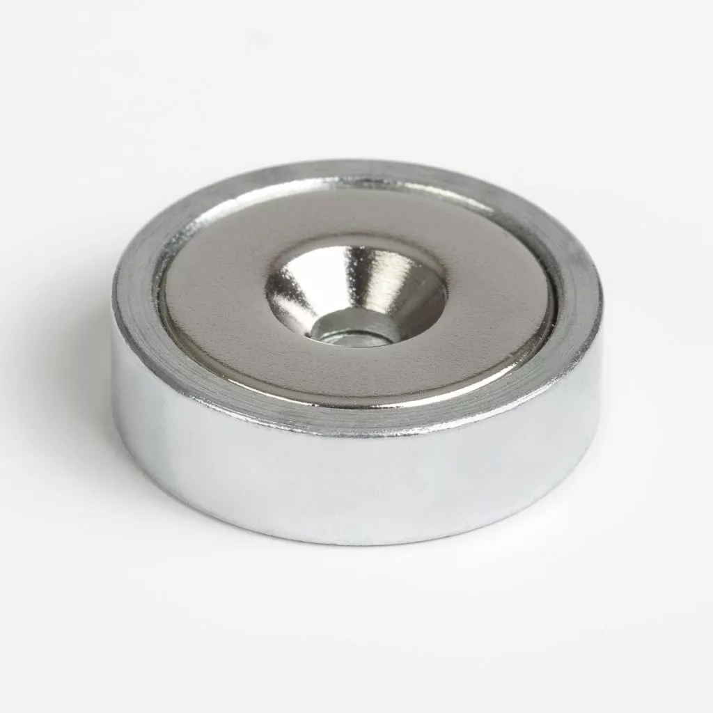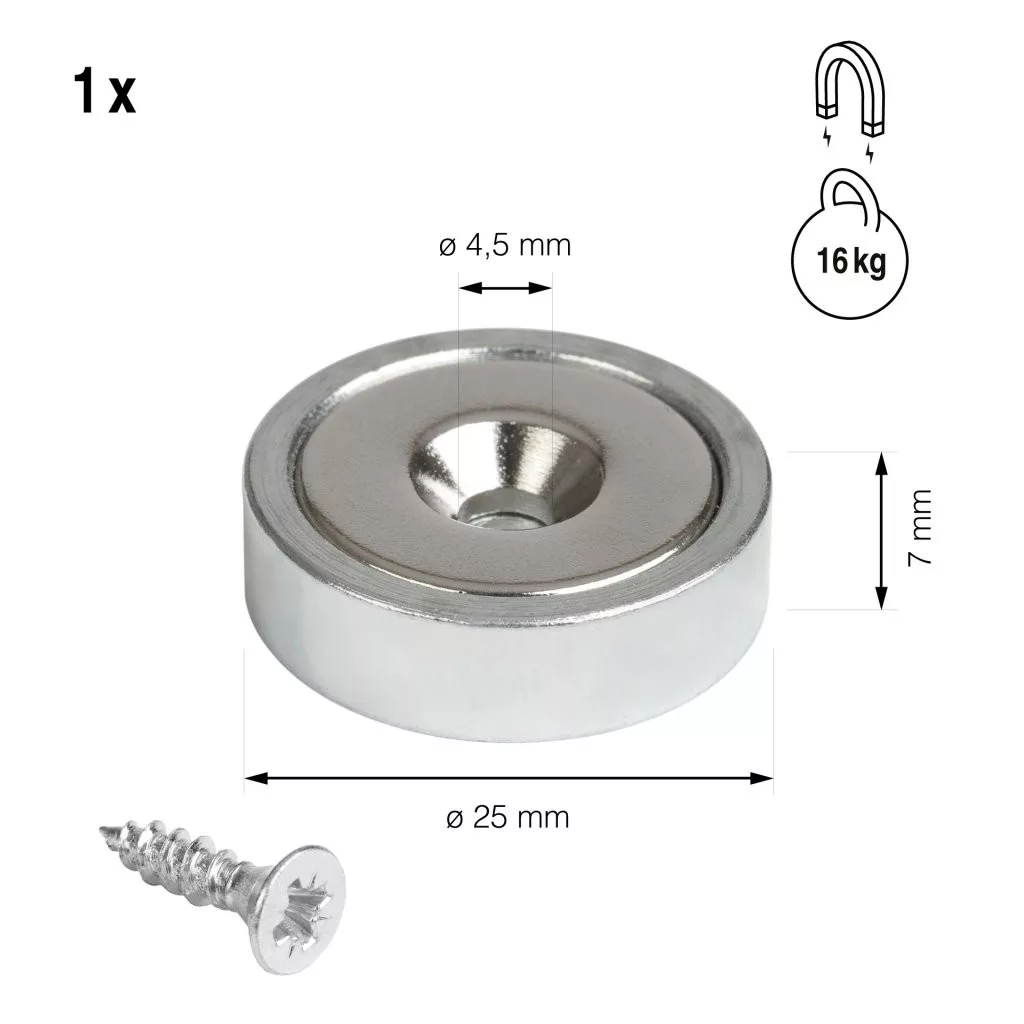 25 mm átmérőjű és 7 mm magas neodímium körmágnes, maximális teherbírása 16 kg. Az acél házban egy 4,5 mm-es bemélyedés található egy csavar számára. Segítünk a neodímium mágnesek kiválasztásában.
