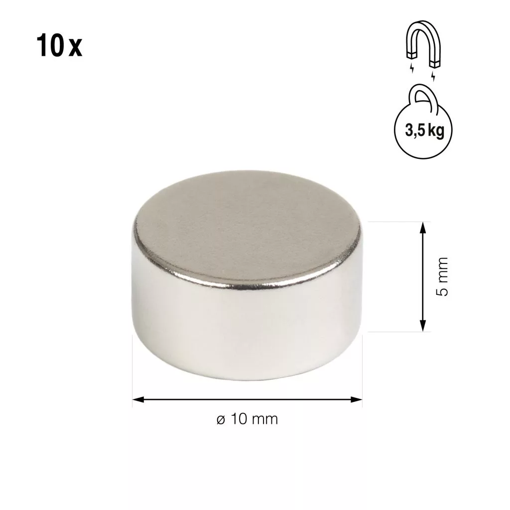 10 mm átmérőjű és 5 mm magasságú neodímium körmágnes, 3,5 kg tapadási erővel. A csomag 10 darabot tartalmaz. Segítünk a neodímium mágnesek kiválasztásában.