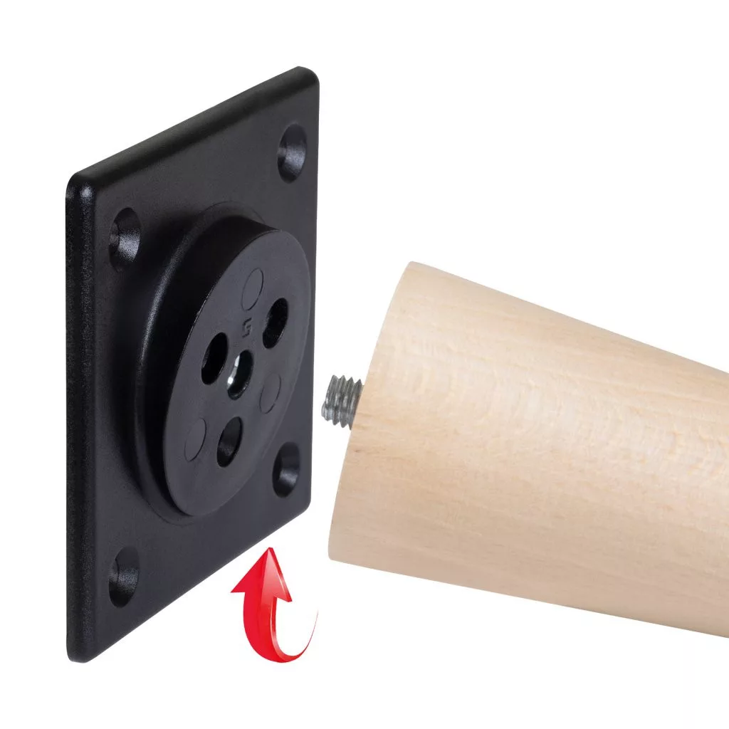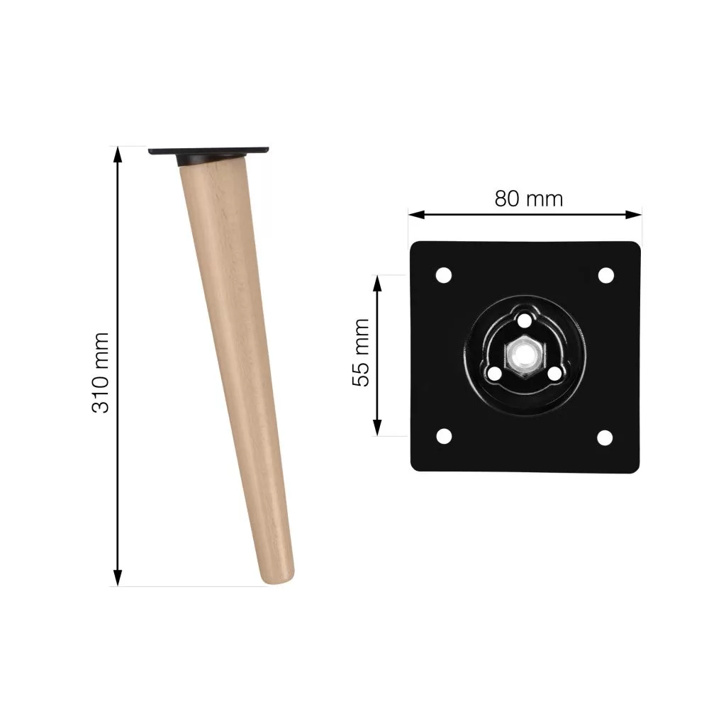 Stílusos, lakkozott bükk bútorláb, teljes magassága 310 mm, átmérője 48 mm/24 mm (a legkeskenyebb részen). A 80x80 mm-es lemez biztosítja a bútor szilárd rögzítését. Lehetőség van adapter vásárlására a bútorláb egyenes megjelenésének eléréséhez.