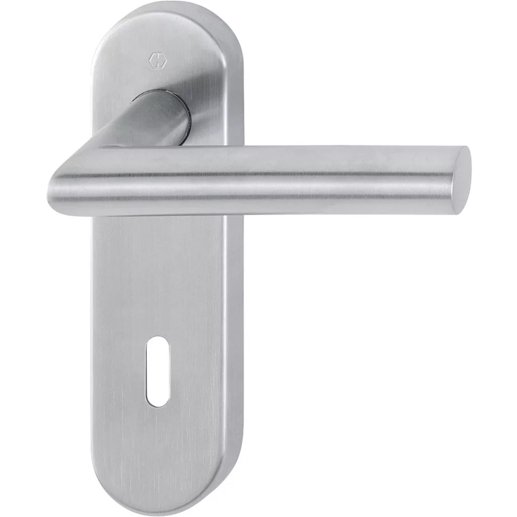 A garnitúra nemesacélból készül, matt felületkezeléssel. Ez a kombináció ellenálló a mindennapi használattal járó igénybevétellel szemben, és esztétikailag is tartós megoldást nyújt. A matt felület kevésbé érzékeny az ujjlenyomatokra és az apró karcokra, így az ajtó hosszabb ideig megőrzi ápolt, rendezett megjelenését.