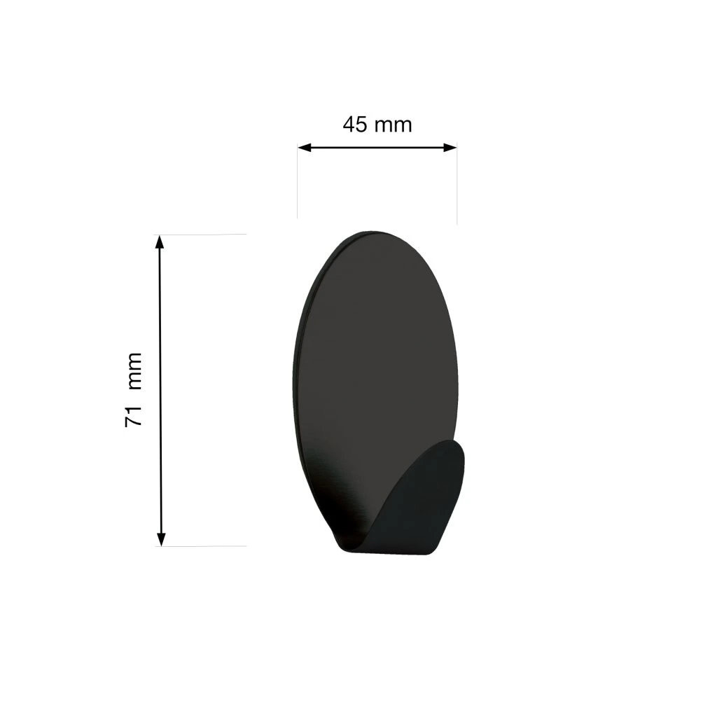 Ovális, öntapadós akasztó matt fekete színben, 45 mm széles, 71 mm magas és 28 mm mély. A csomag 2 db-ot tartalmaz.