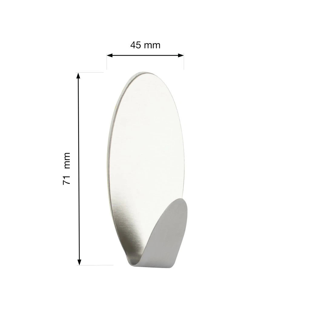 Nagy, ovális, rozsdamentes acélból készült, öntapadós akasztó, 45 mm szélességgel, 71 mm magassággal és 28 mm mélységgel. Az anyaguknak köszönhetően alkalmasak párás környezetbe - nem rozsdásodnak. A csomag 2 db-ot tartalmaz.