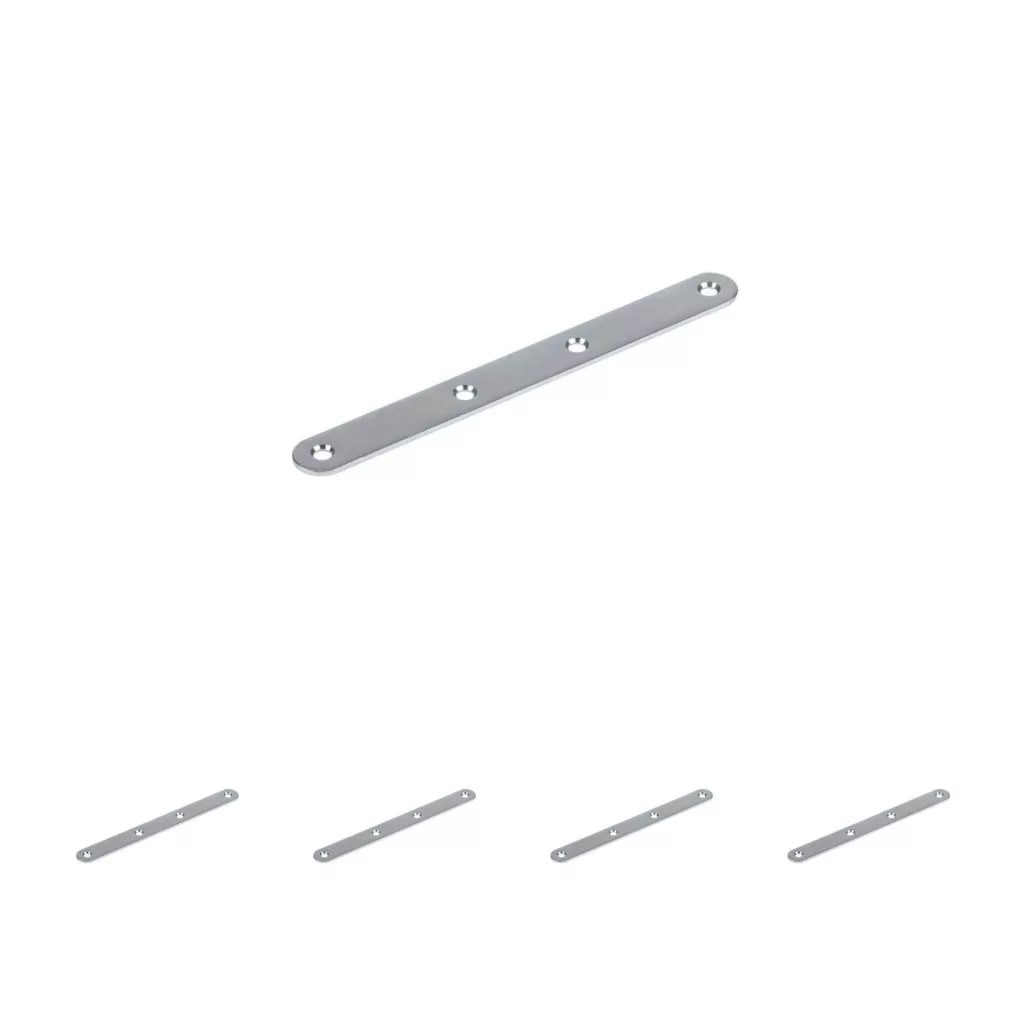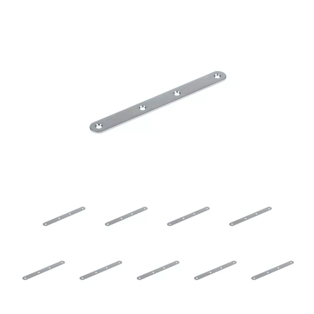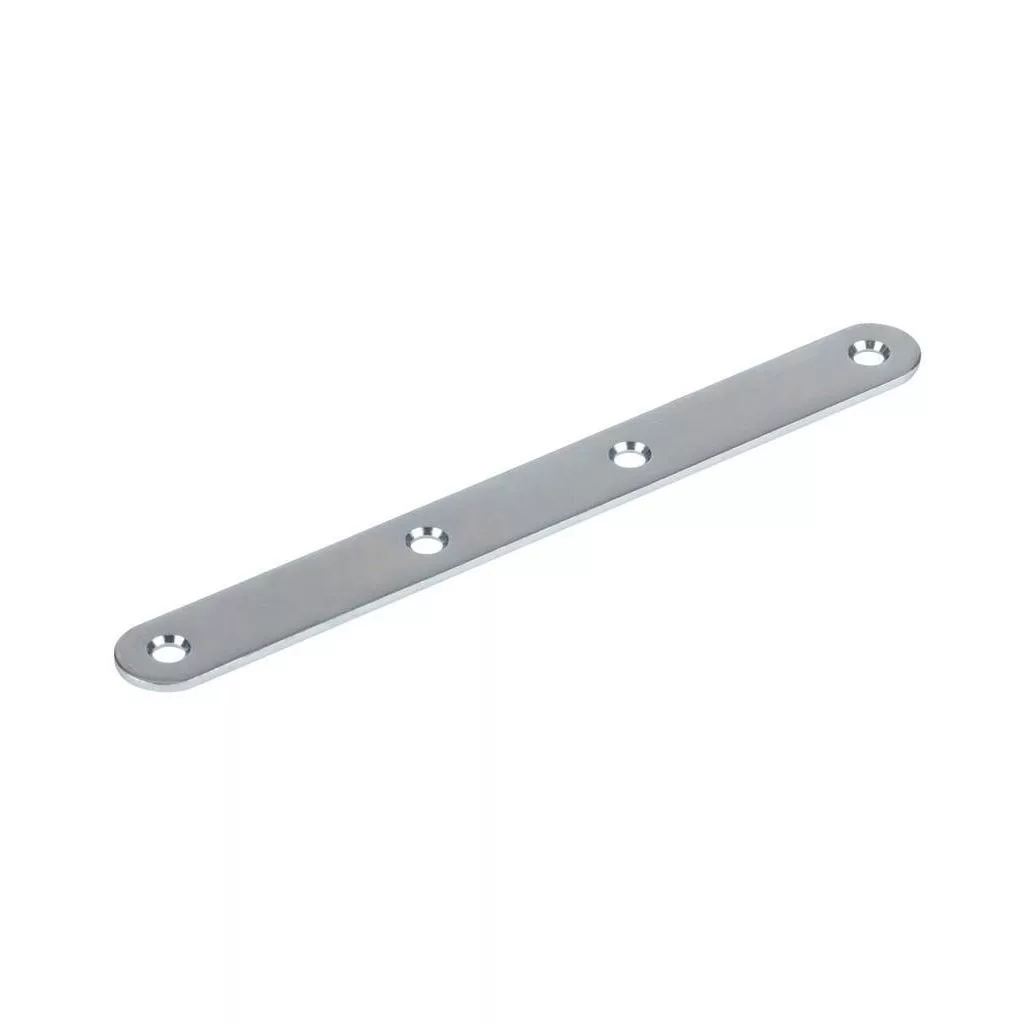 Horganyzott összekötő lemez, 140 mm hosszú és 15 mm széles, süllyesztett rögzítőfuratokkal.