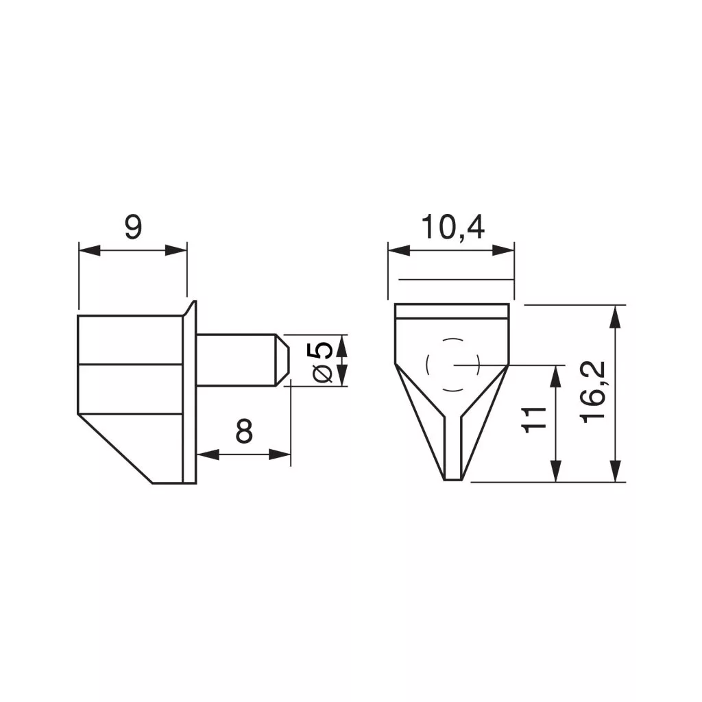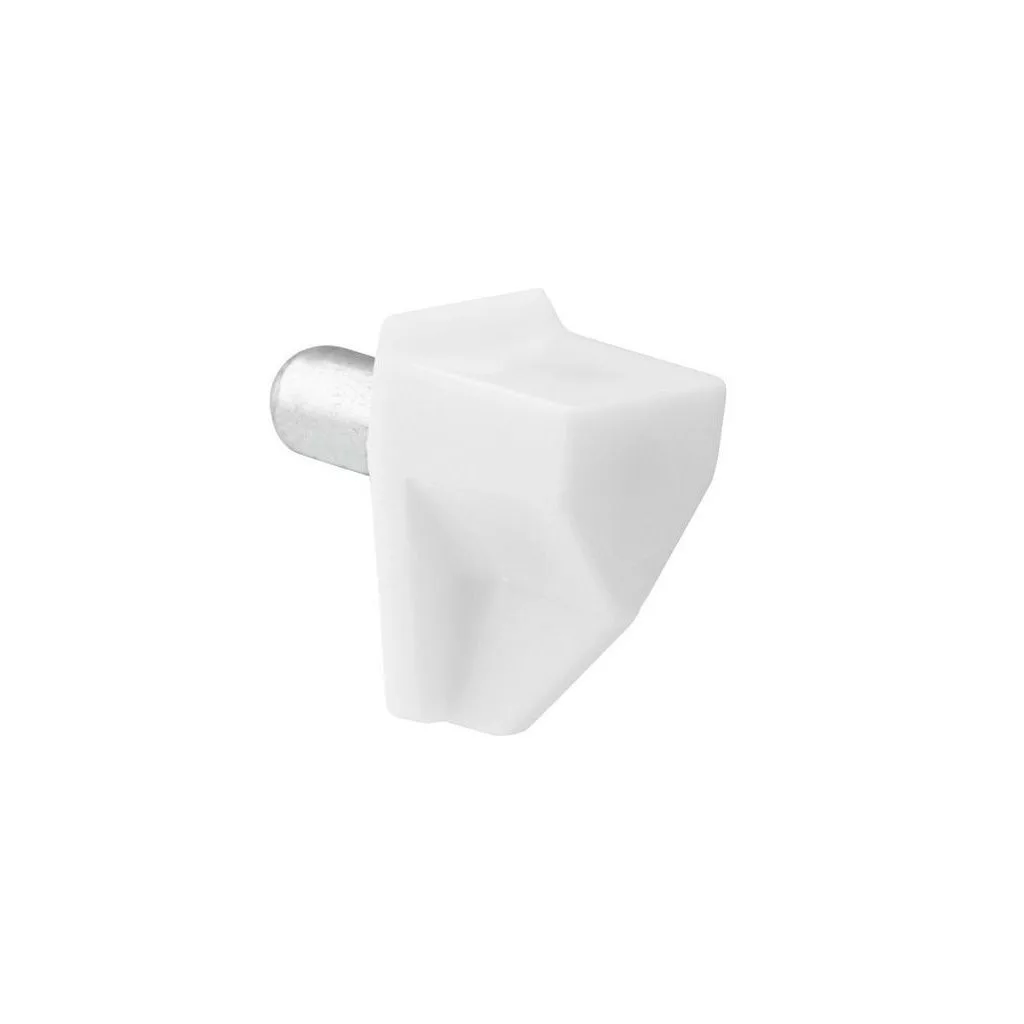 12 mm széles, fehér műanyag polctartó, 5 mm átmérőjű és 8 mm hosszú fémcsappal. A tartót a bútor oldalán előre fúrt lyukakba kell behelyezni.
