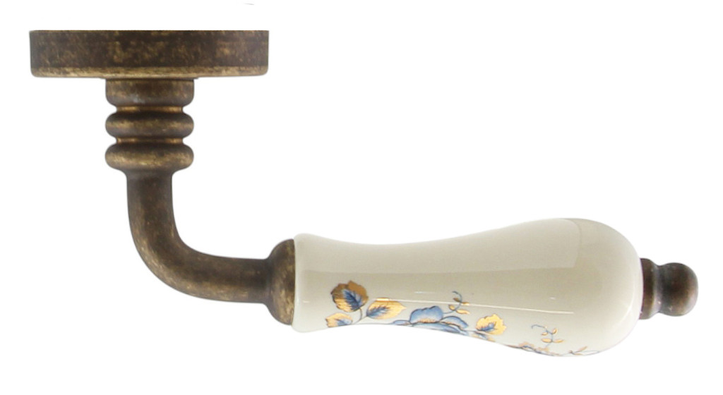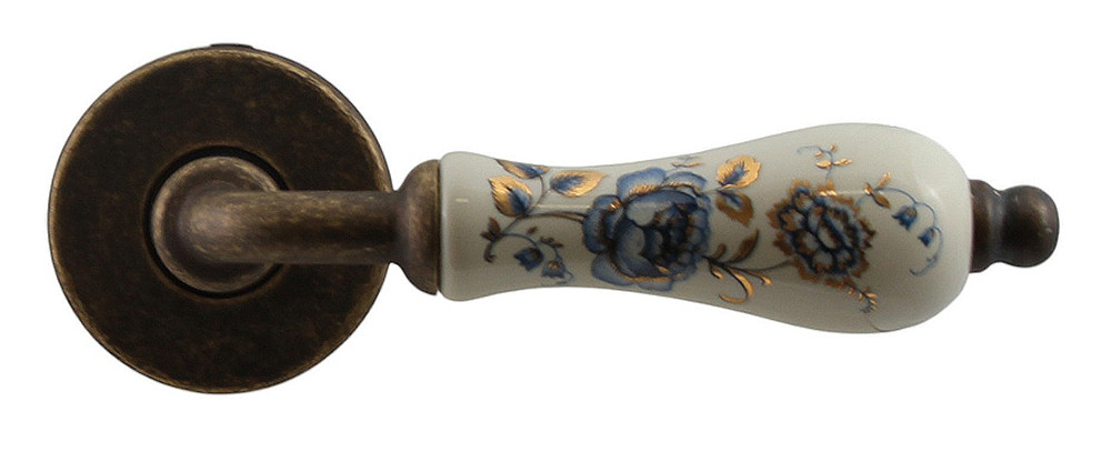Samoha-Diána Körrozettás Fehér-Kék Virágos Porcelán Betétes Patinás Antik (Csak Kilincs Felső Rozettán)
