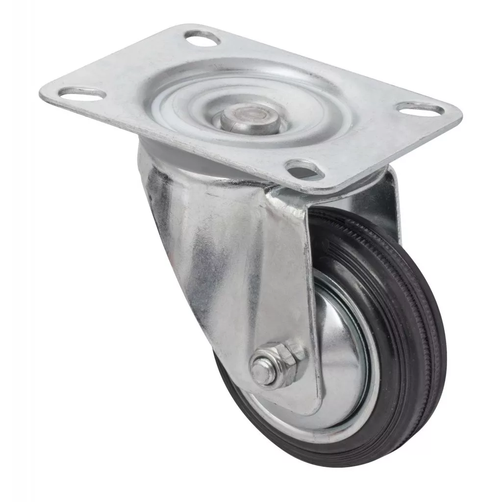80 mm átmérőjű, forgó szállítókerék, 50 kg dinamikus teherbírással. A kerék magassága 106 mm, a tányér mérete 105 x 80 mm. Puha és kemény padlóra tervezve.