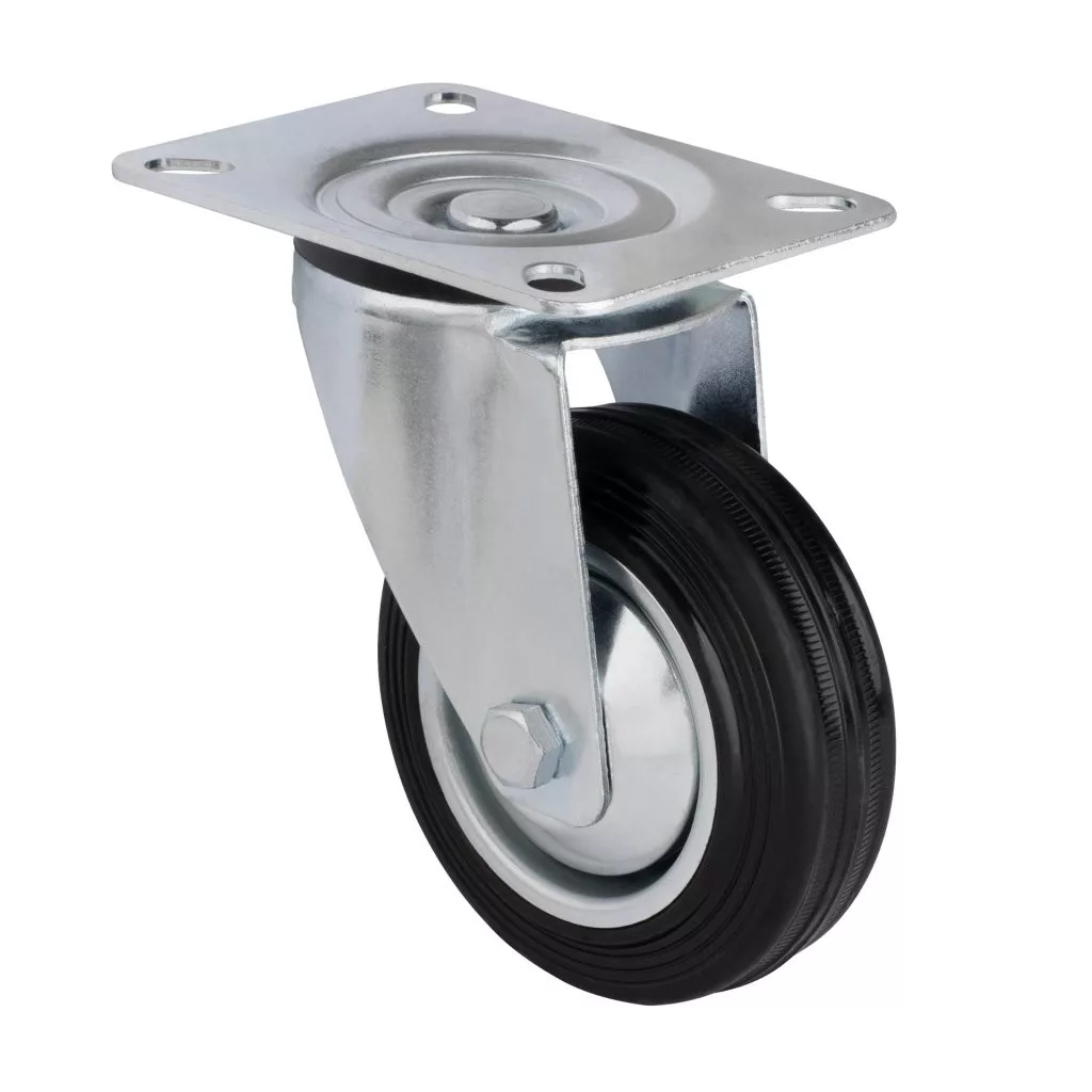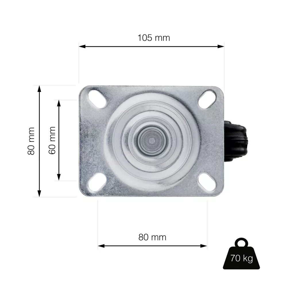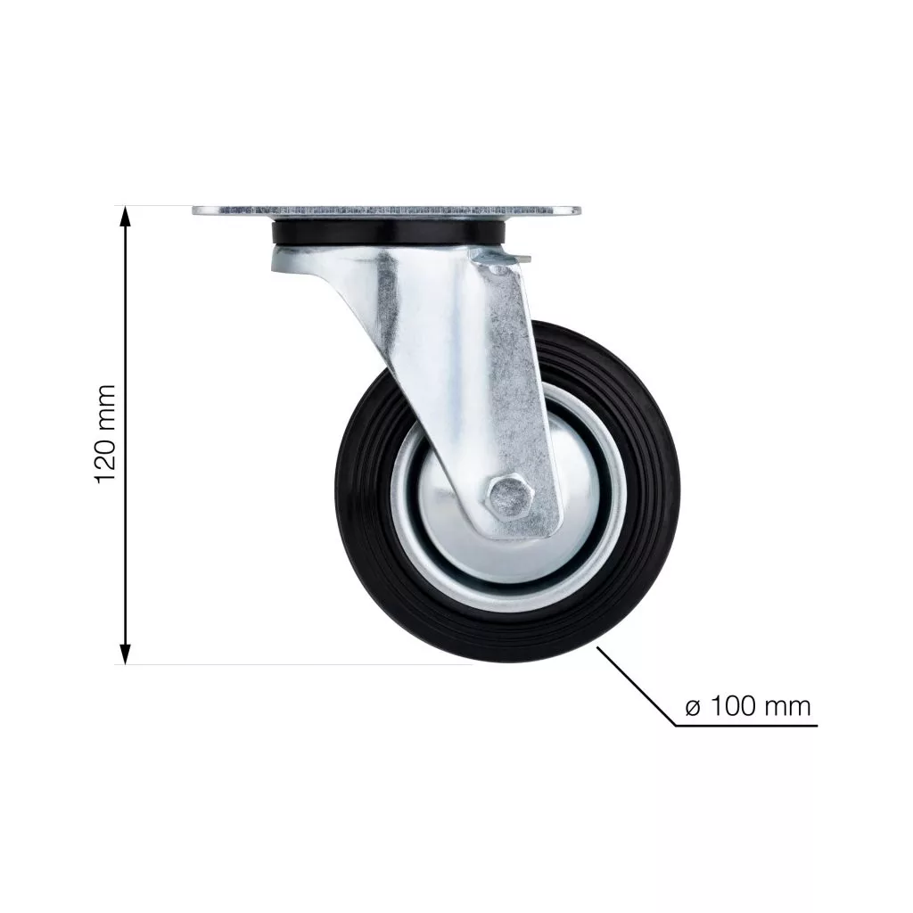 100 mm átmérőjű, forgó szállítókerék 70 kg dinamikus teherbírással. Kerékmagasság 128 mm, 105 x 80 mm méretű tányérral. Puha és kemény padlóra tervezve.