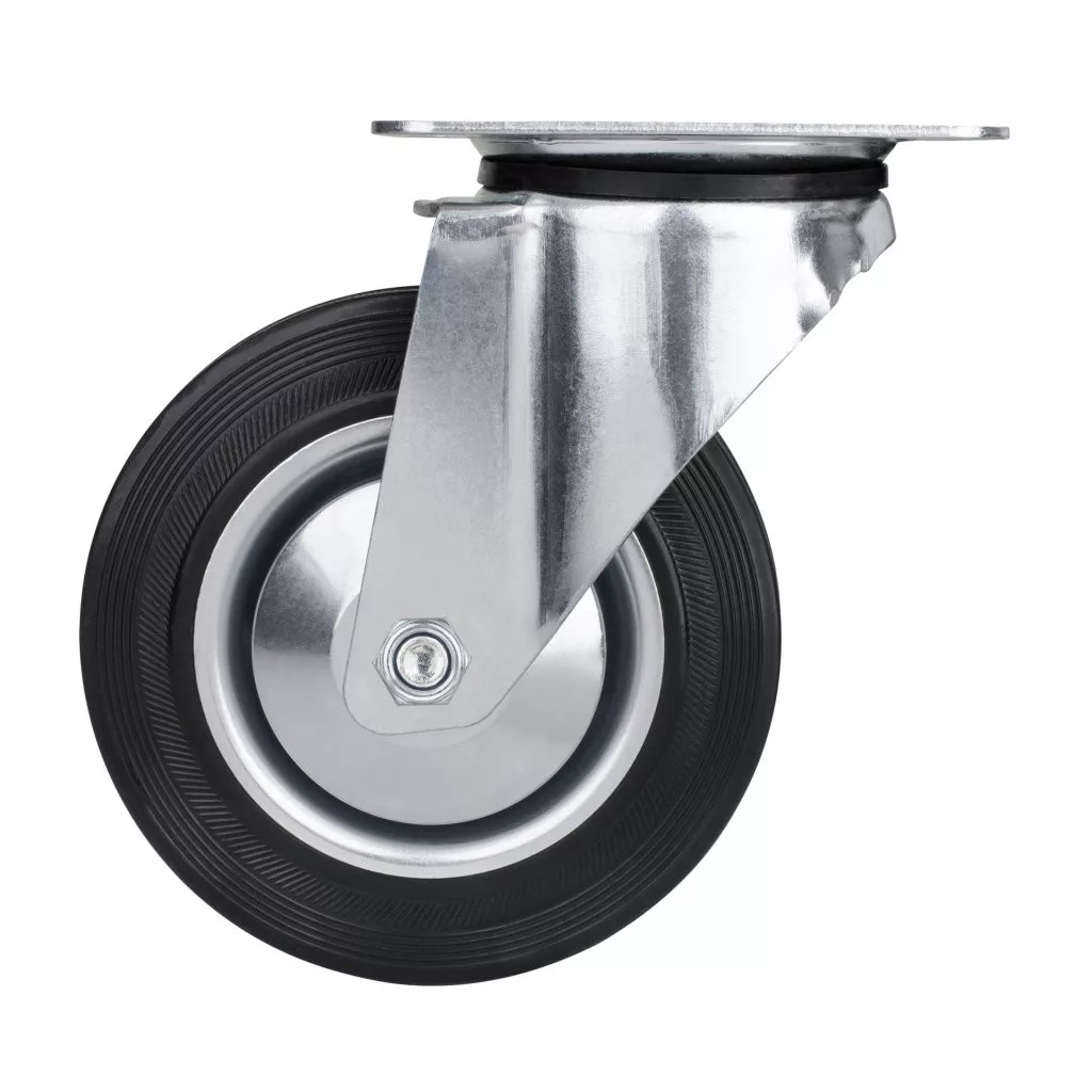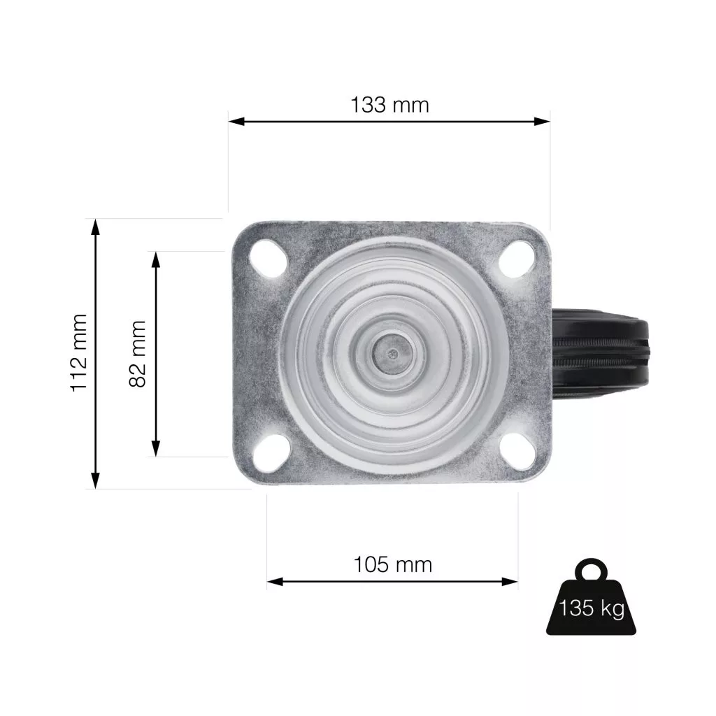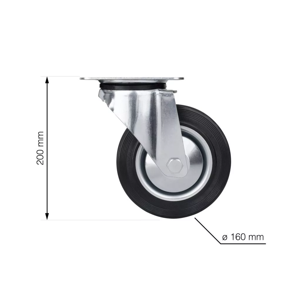 160 mm átmérőjű, 135 kg dinamikus teherbírású, forgó szállítókerék. 200 mm-es kerékmagasság, mérőlappal.
