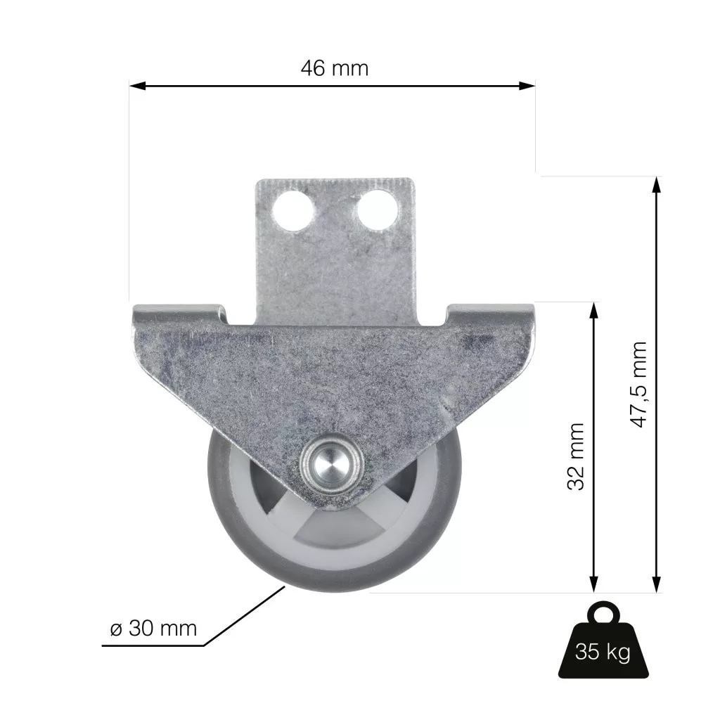 30 mm átmérőjű szekrénygörgő kemény padlóra tervezve. Teherbírás akár 35 kg.