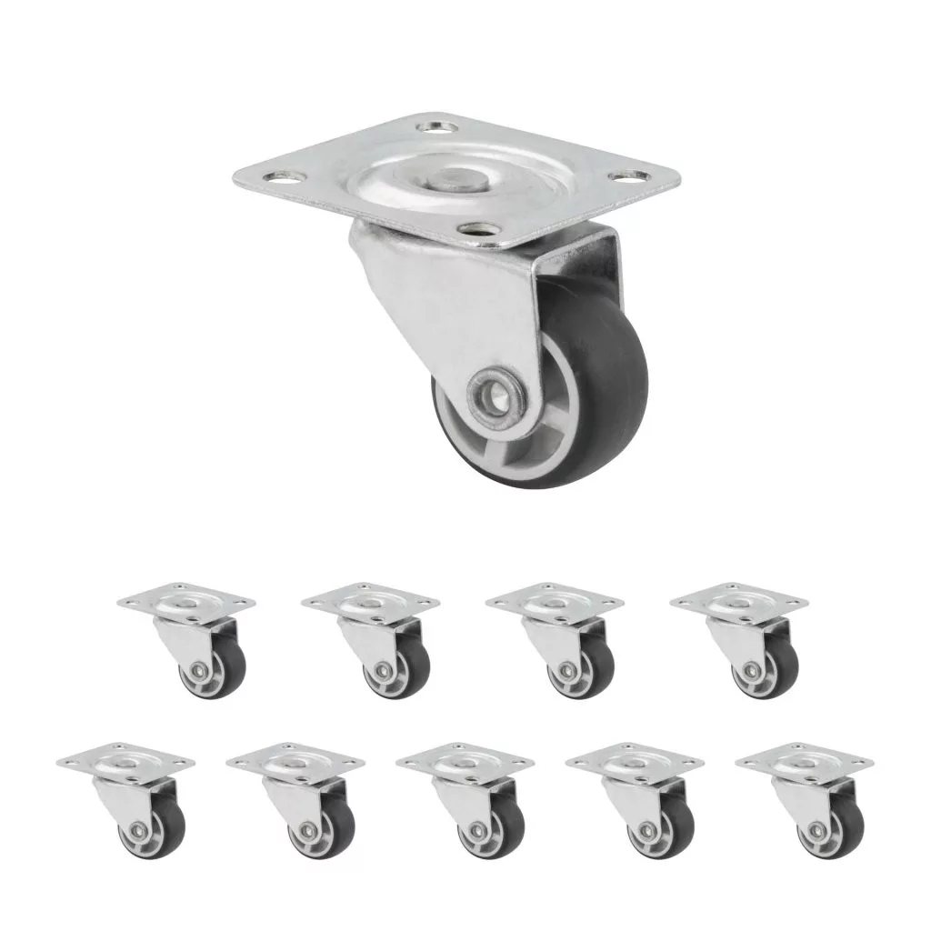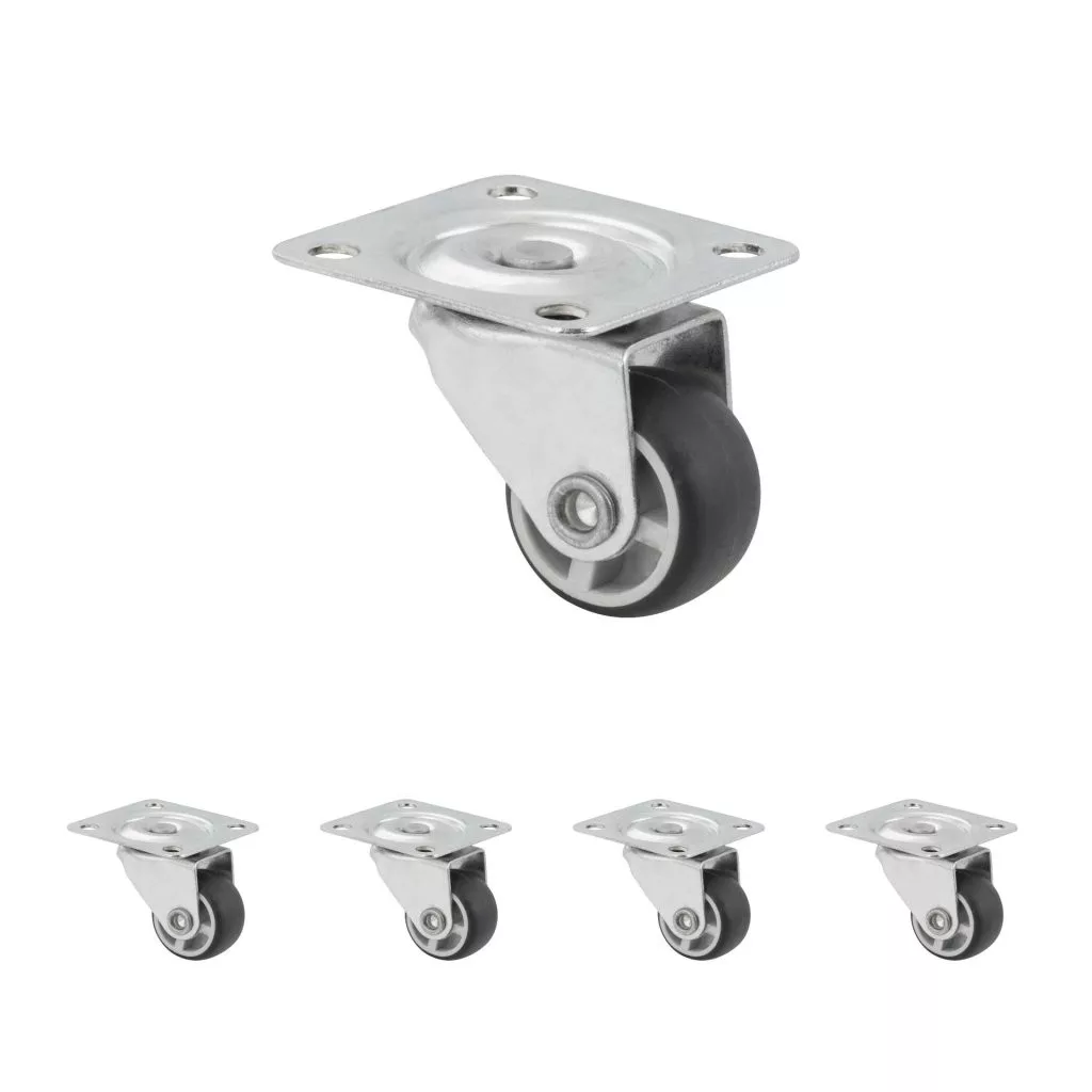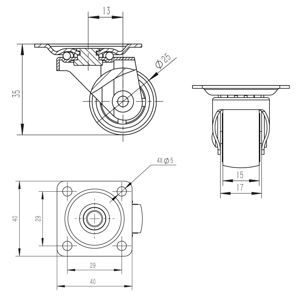 25 mm átmérőjű készülékkerék 15 kg dinamikus teherbírással. A kerék magassága 34 mm, a tányér mérete 40 x 40 mm. Kemény padlóra tervezve.