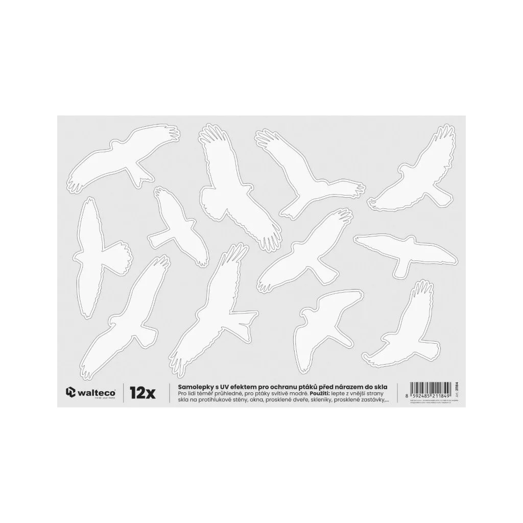 A 250 × 350 mm-es ragadozó sziluett alakú üvegmatricák az üvegfelületek védelmére és a madarak üvegnek ütődéskor történő sérüléseinek minimalizálására szolgálnak. Főként üvegfelületű épületeken, üvegházakban, télikertekben vagy buszmegállókban használják őket. Az UV-álló anyagnak köszönhetően a matrica hosszú távú kültéri használatra is alkalmas. A felhelyezése nagyon egyszerű - a matrica egy levehető fóliára van ragasztva, amelyet csak le kell húzni és a megtisztított üvegfelületre kell helyezni. A csomag 12 darabot tartalmaz.