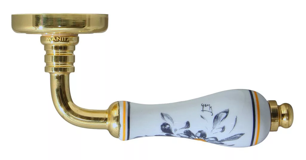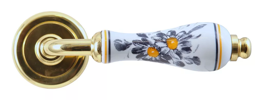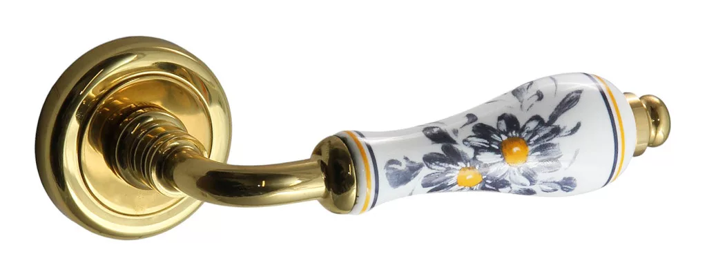 Rusztikus jellegű fényes réz rozettás ajtókilincs porcelán betétes nyéllel. Olasz tervezésű termék. Szállítás: 10-20 munkanap. Ajtókilincs NEM RÉZ alapanyagból készül. Rugós működtetésű kilincs. Ajtócímke rozetta átmérője: 50 mm Sild magassága: 11 mm. Kilincsméret: 120 mm.