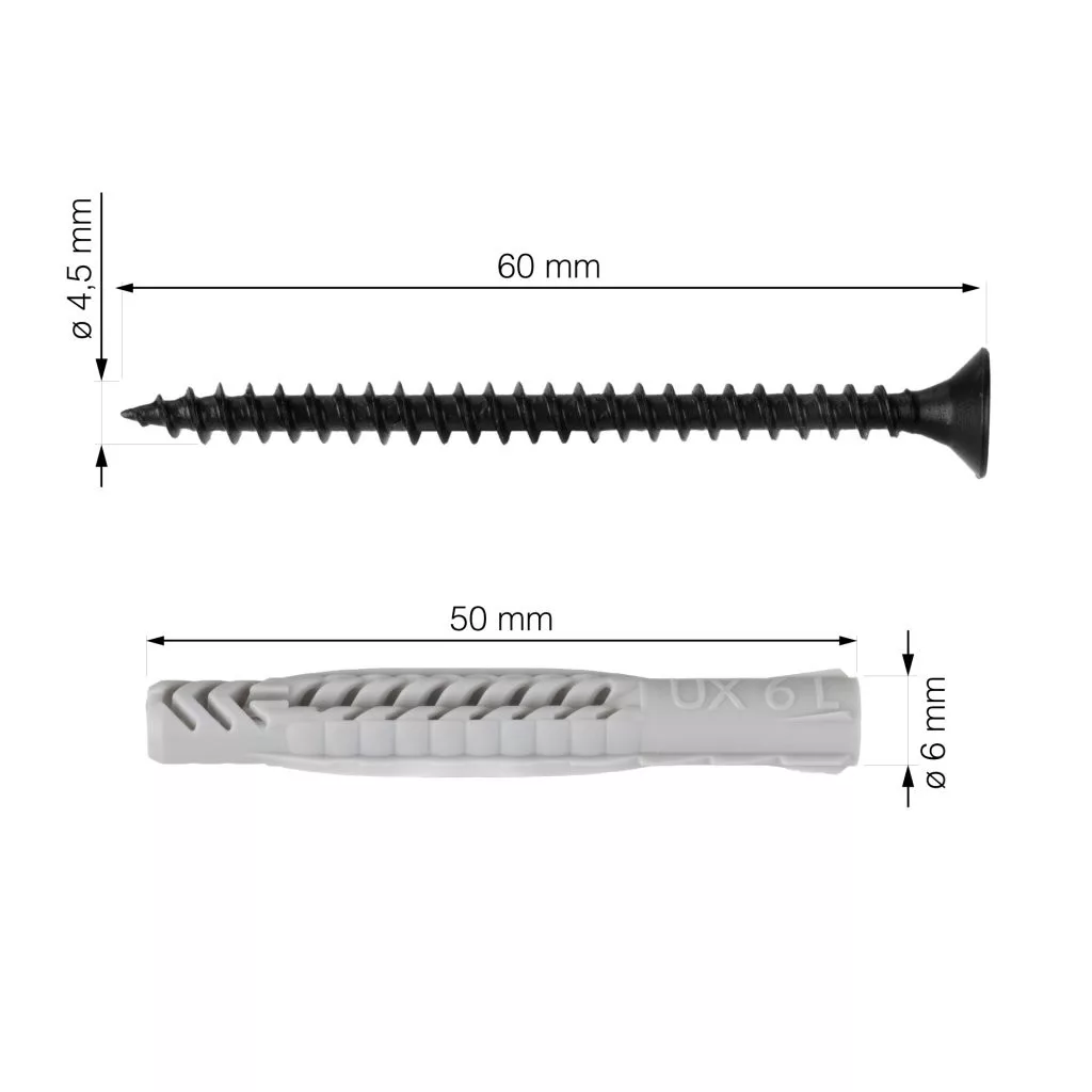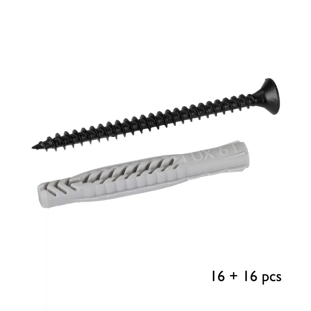 A készlet 16 fekete csavart (átmérő 4,5 mm; hossz 60 mm) és 16 Fischer dübelt (átmérő 6 mm, hossz 50 mm) tartalmaz.