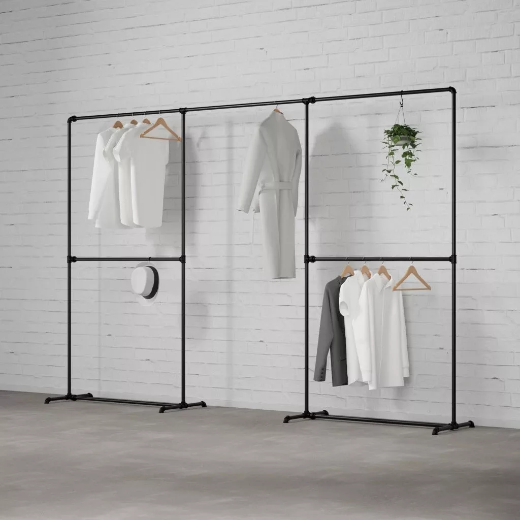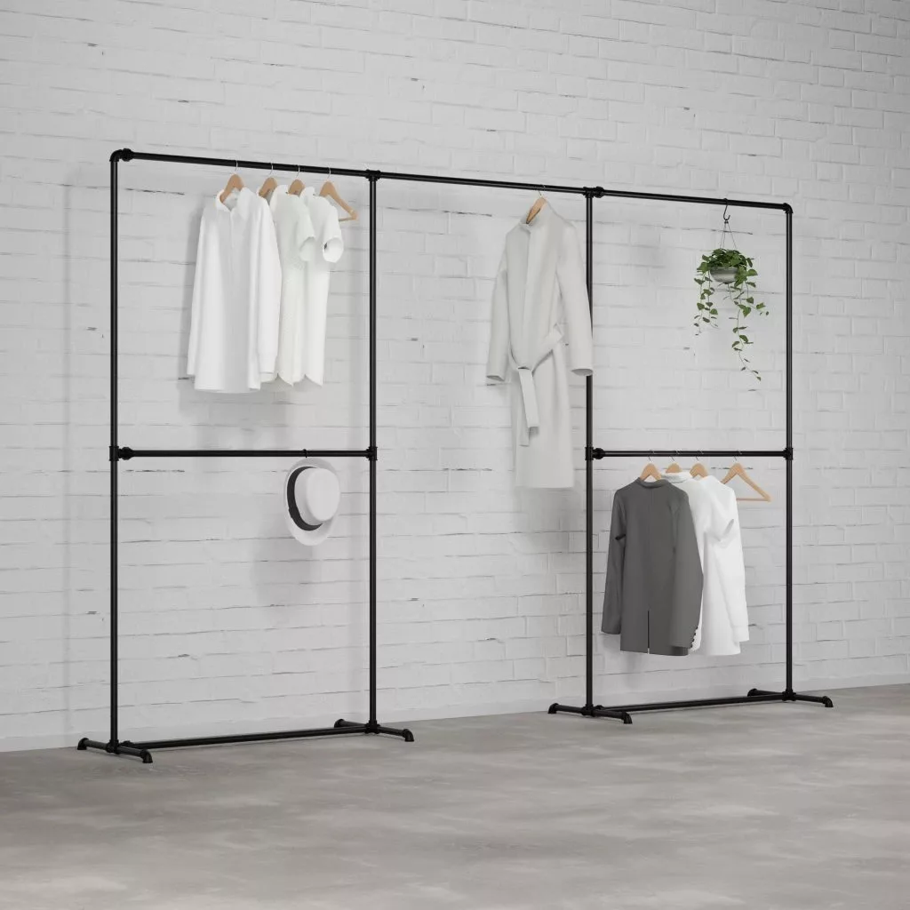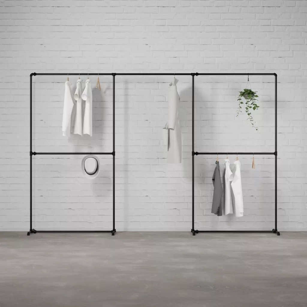 A Rusticline csőrendszerből készült, 2100 mm magas és 3300 mm széles FREJA V gardróbszekrény szett különlegessé teszi gardróbjait, előszobáit, hálószobáit vagy ruhatárait. Variálhatóságának köszönhetően bármilyen térbe illeszkedik, mivel az állványt bárhová áthelyezheti, ahol szüksége van rá.
