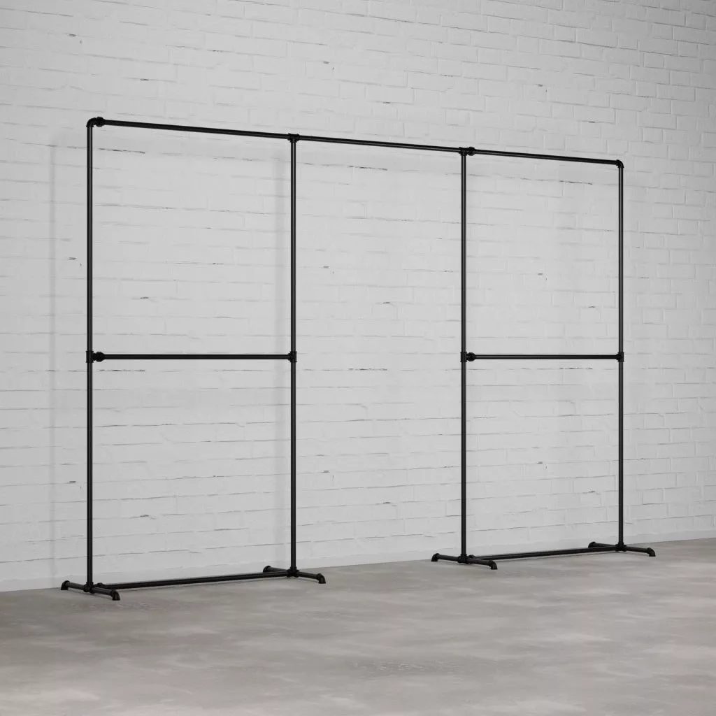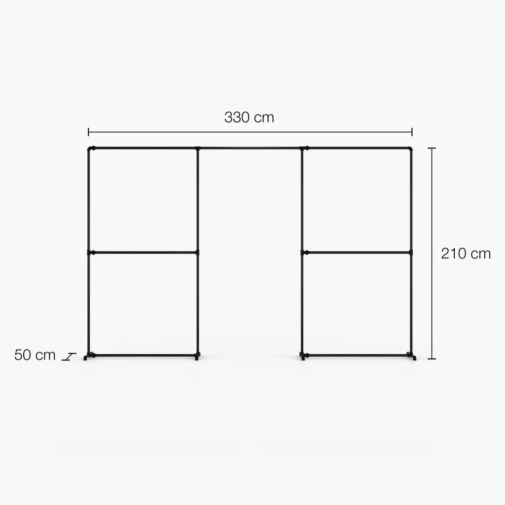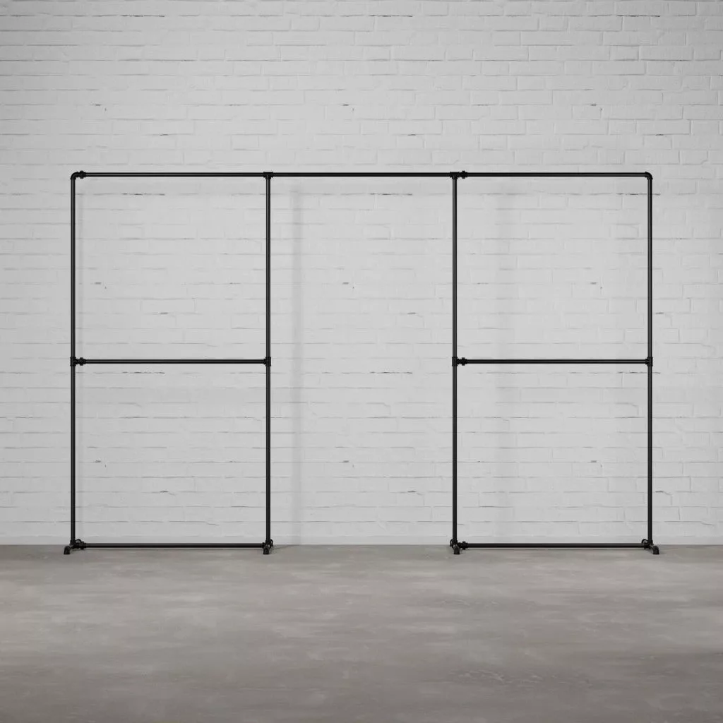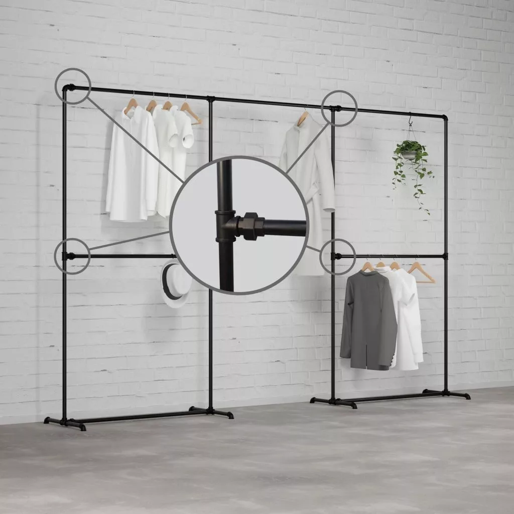 A Rusticline csőrendszerből készült, 2100 mm magas és 3300 mm széles FREJA V gardróbszekrény szett különlegessé teszi gardróbjait, előszobáit, hálószobáit vagy ruhatárait. Variálhatóságának köszönhetően bármilyen térbe illeszkedik, mivel az állványt bárhová áthelyezheti, ahol szüksége van rá.
