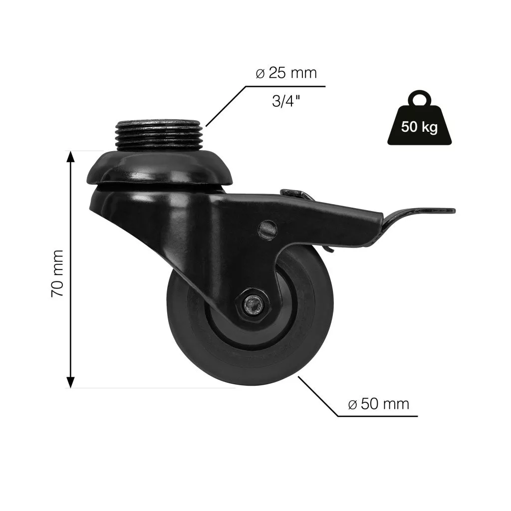 Kemény padlóra való görgő 50 mm átmérőjű forgó 3/4" menettel RT-59 fékkel teherbírás 50 kg fekete