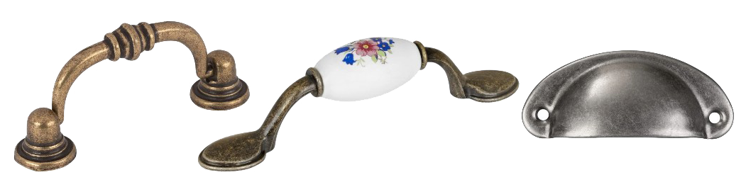 A rusztikus bútorfogantyúk általában fémből készülnek antik és patinás sárgaréz színben. Az elegáns fogantyúkat porcelán fogantyúval kombinálják, amely lehet tiszta fehér vagy virágmotívumokkal díszített.