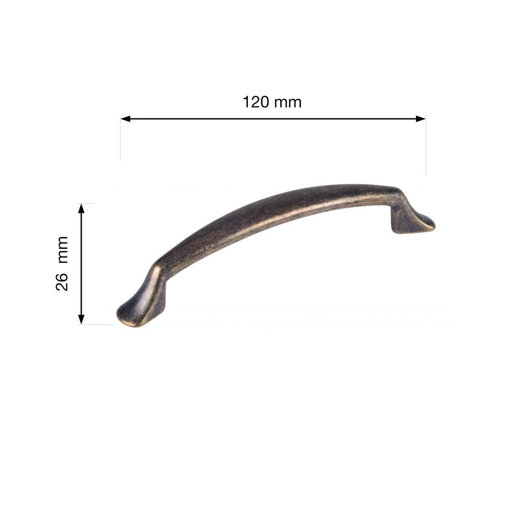 Setra bútorfogantyú rusztikus stílusban, 96 mm-es tengelytávolsággal és antik sárgaréz felülettel. Fogantyúhossz 120 mm, szélessége 14 mm és magassága 26 mm. Rögzítőcsavarok mellékelve.