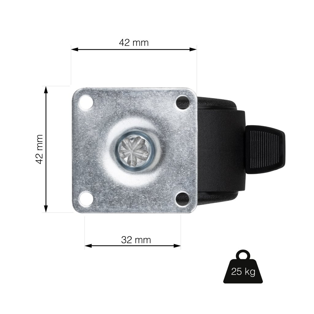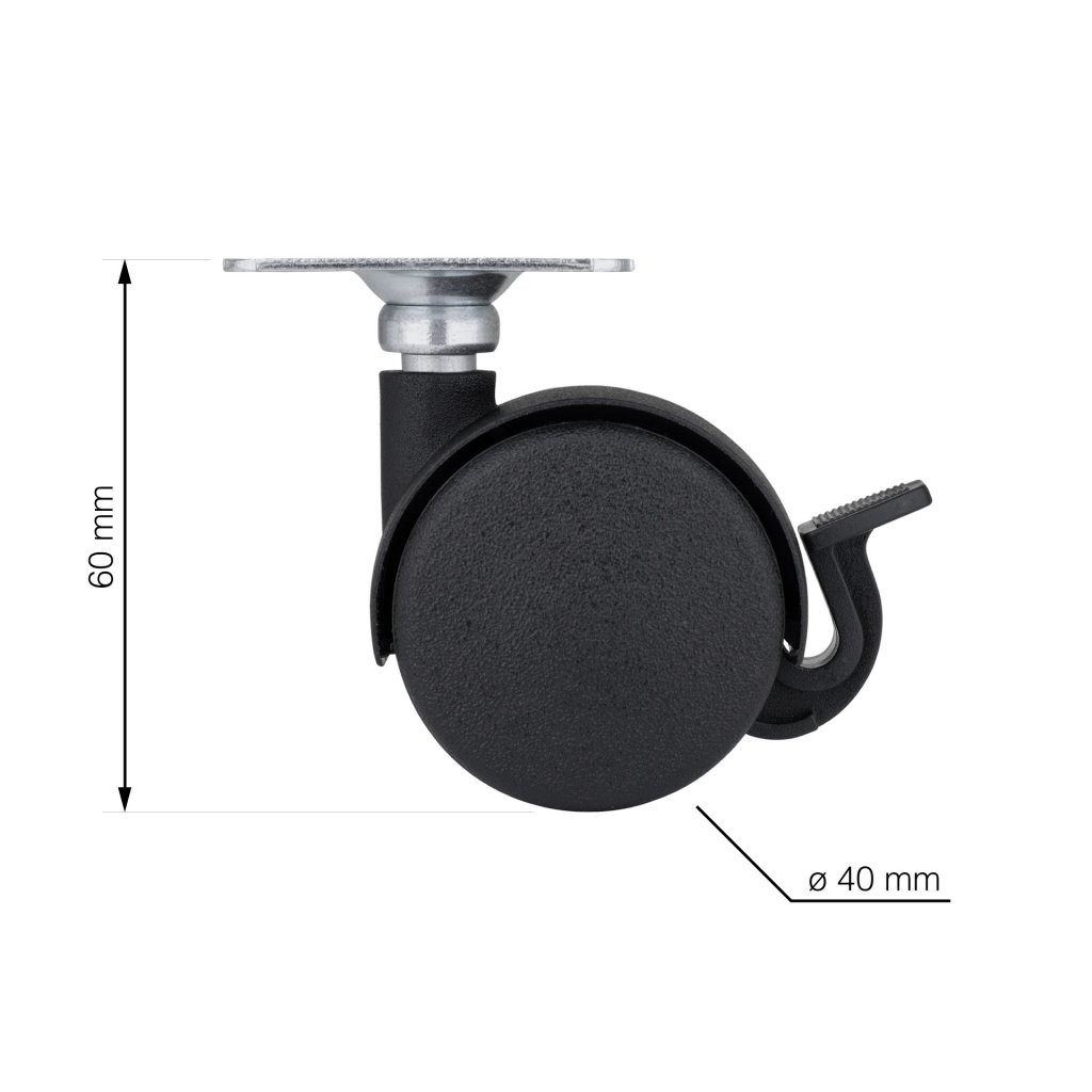 Fekete, teljesen műanyag dupla kerék fékkel, 40 mm átmérőjű, dinamikus teherbírás akár 25 kg. Kerékmagasság 60 mm, talpméret 42 x 42 mm. Görgők puha padlóra.