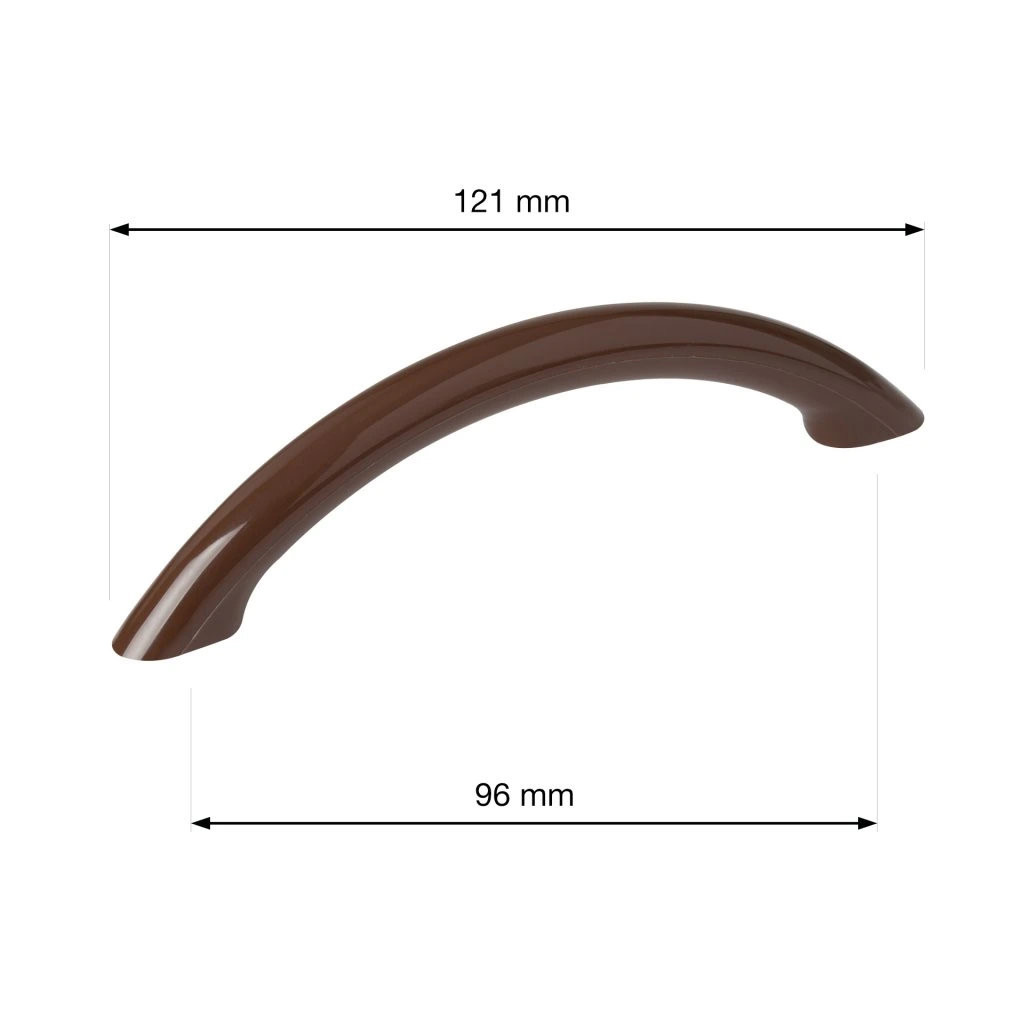 Klasszikus dizájnú, műanyag Béta bútorfogantyú, 96 mm-es tengelytávolsággal, barna színben. A fogantyú hossza 121 mm, szélessége 10 mm, magassága 30 mm. Rögzítőcsavarokkal együtt.