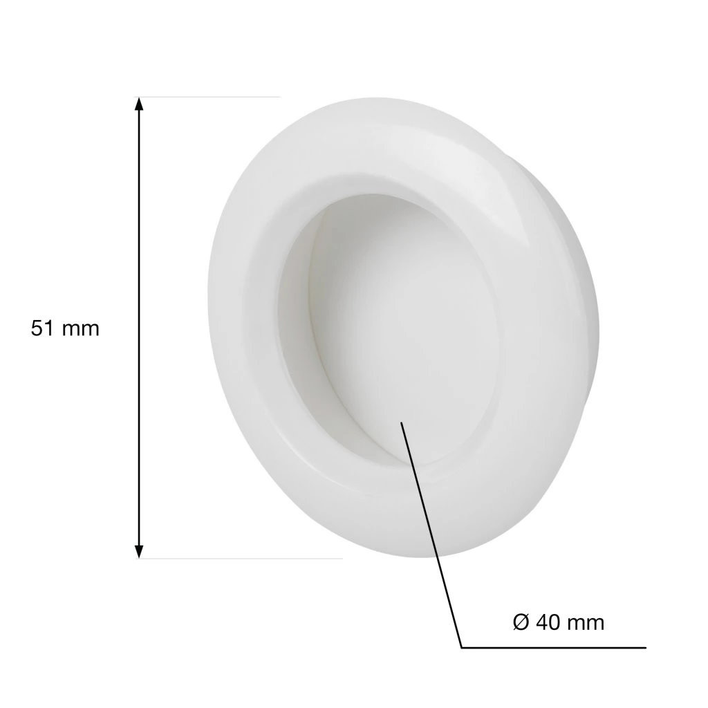 Műanyag, süllyesztett bútorfogantyú, 51 mm átmérővel és 15 mm magassággal, fehér színben. A süllyesztett fogantyú átmérője 40 mm, mélysége 11 mm.