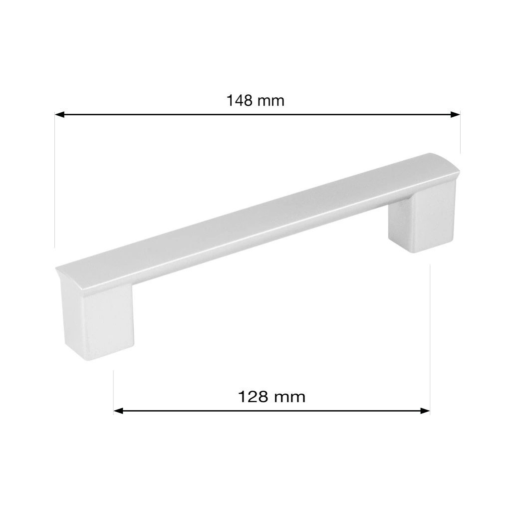 Modern műanyag Porta bútorfogantyú 128 mm-es tengelytávolsággal és alumínium felülettel. A fogantyú hossza 148 mm, szélessége 18 mm és magassága 28 mm. Rögzítőcsavarokkal együtt.