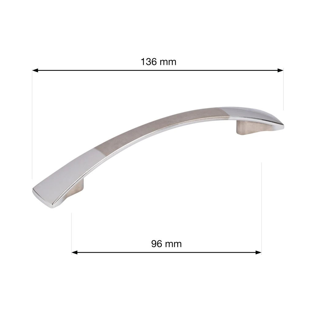 Livorno bútorfogantyú klasszikus dizájnban, 96 mm-es tengelytávolsággal, króm és szálcsiszolt szatén nikkel felülettel. Fogantyúhossz 136 mm, szélesség 18 mm és magasság 21 mm. Rögzítőcsavarok mellékelve.