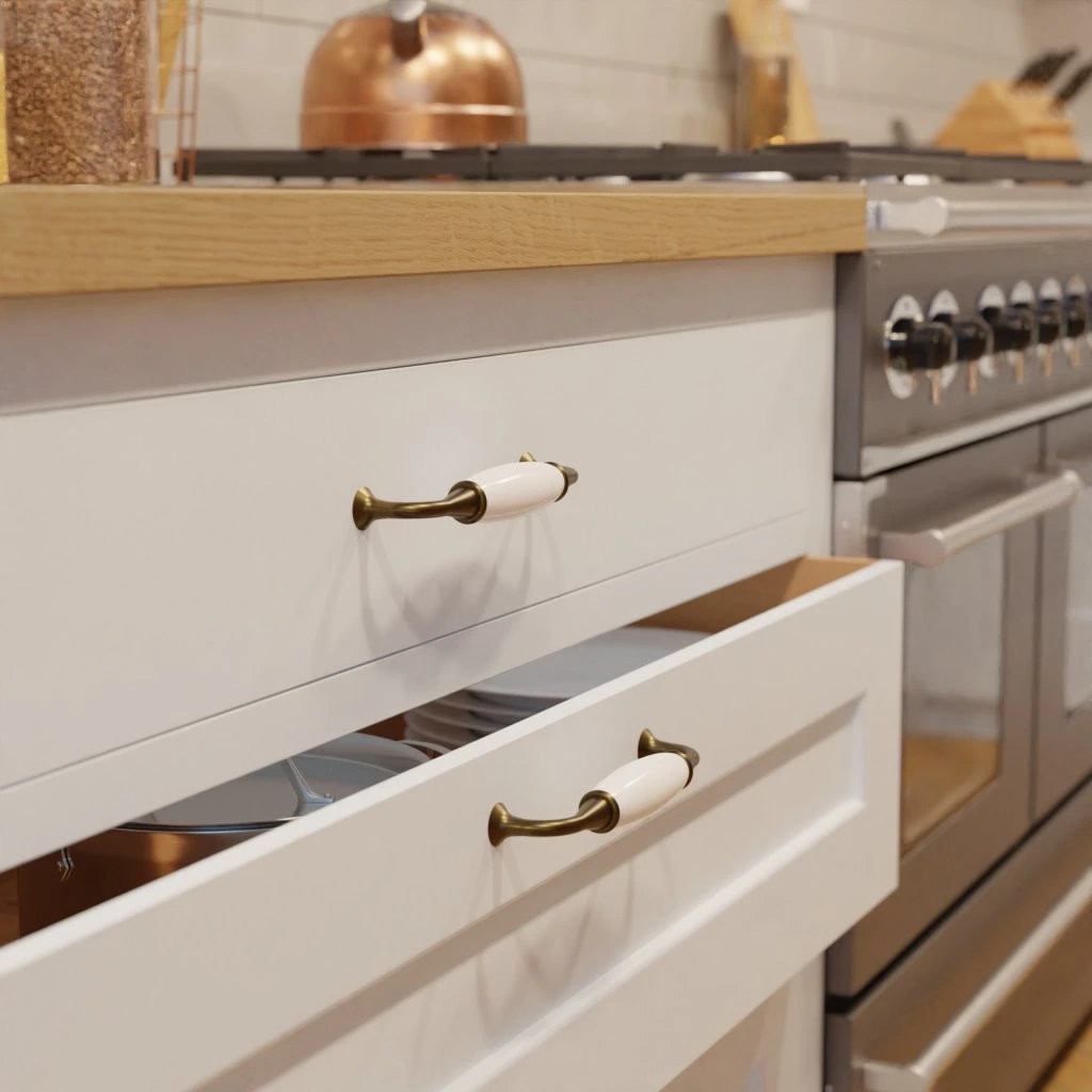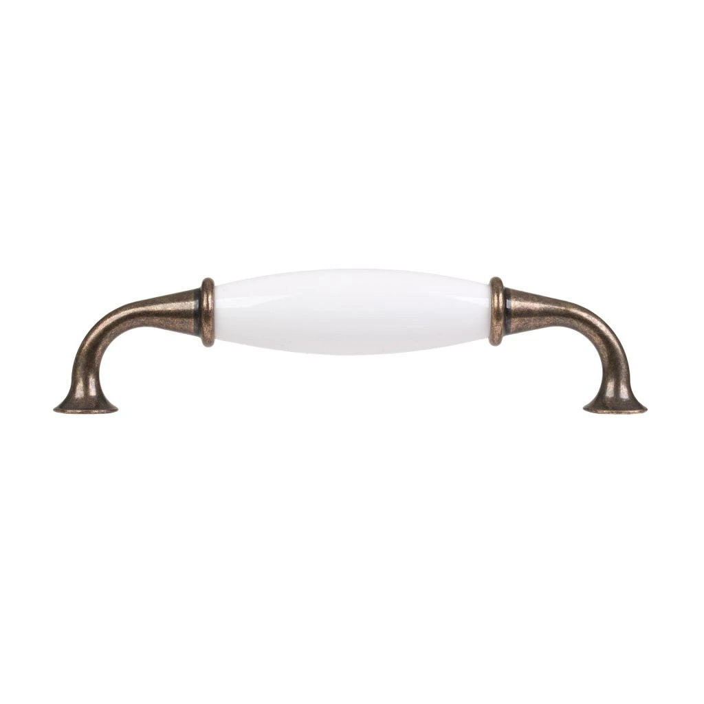 Bútor fogantyú 128 mm-es tengelytávolság antik sárgaréz/porcelán fehér