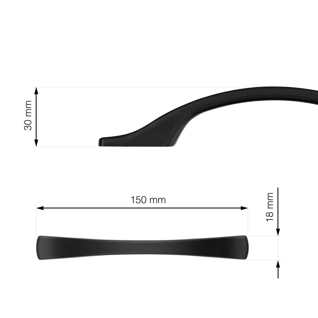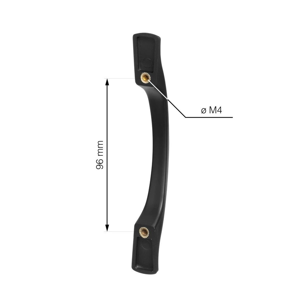 Elegáns műanyag Posta nyél 96 mm-es rasztermérettel, matt fekete színben. Nyélhossz 150 mm, szélesség 18 mm és magasság 30 mm. Rögzítőcsavarokkal együtt.