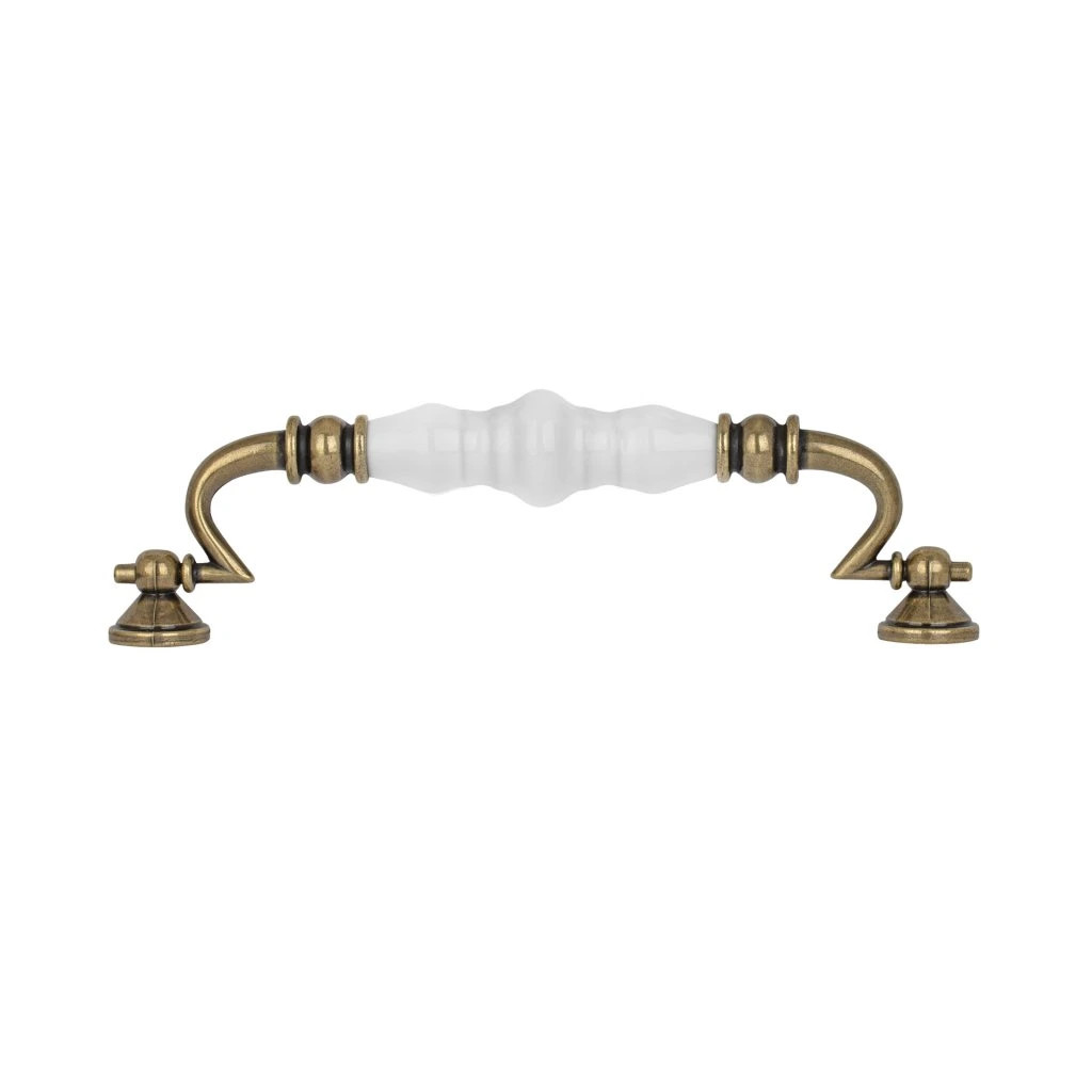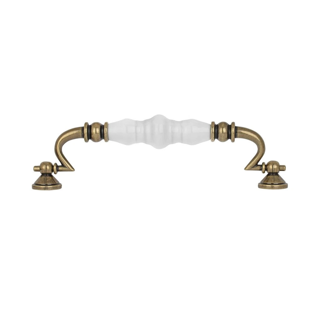 Rusztikus stílusú Ferrara bútorfogantyú 150 mm-es tengelytávolsággal és antik sárgaréz felülettel, fehér porcelán fogantyúval kiegészítve. A fogantyú hossza 170 mm, szélessége 23 mm és magassága 46 mm. Rögzítőcsavarokkal együtt.