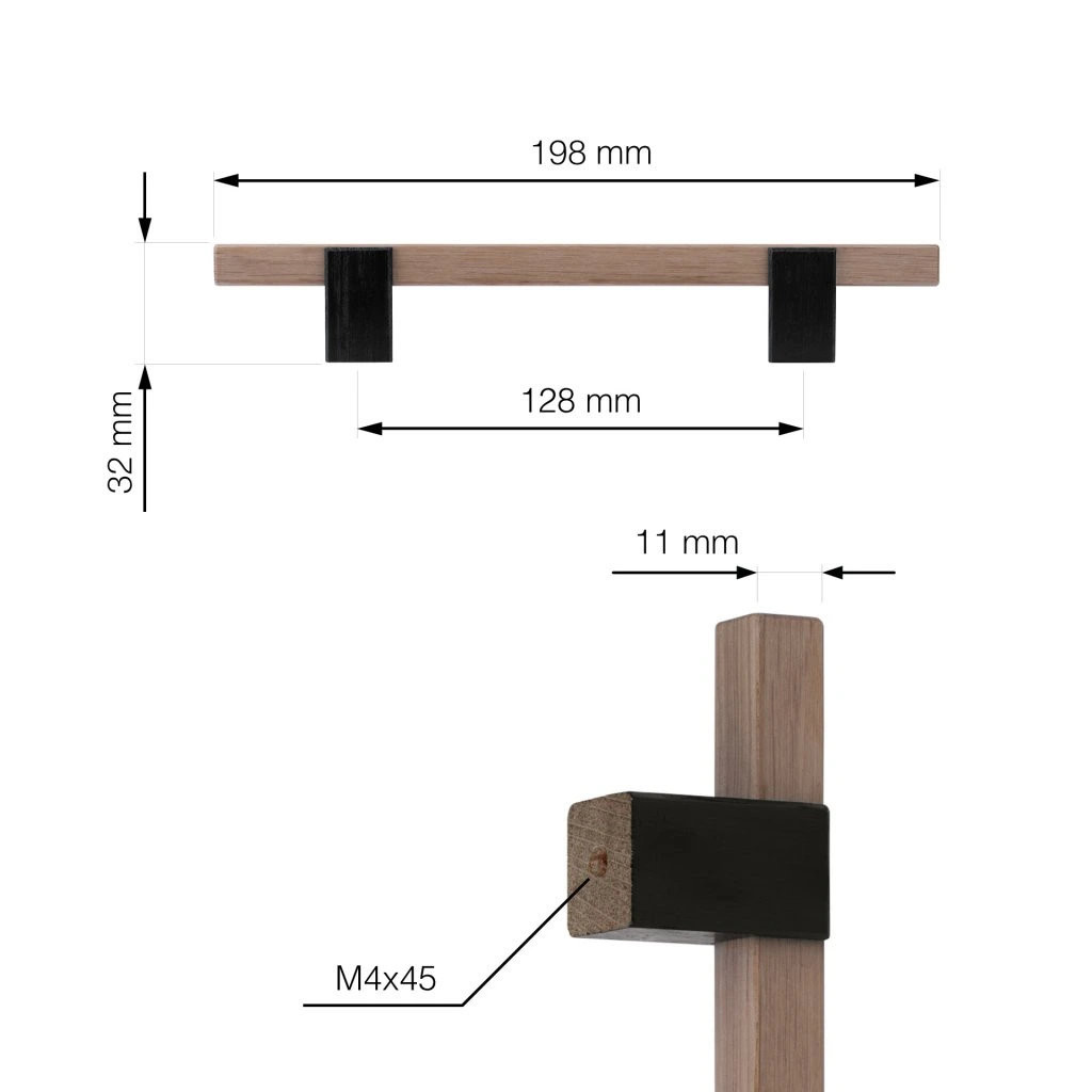 Lorca fa bútorkilincs, 128 mm-es rasztermérettel, natúr lakkozott tölgyfa dekorral. A kilincs hossza 198 mm, magassága 32 mm. A rögzítőcsavarok mellékelve.