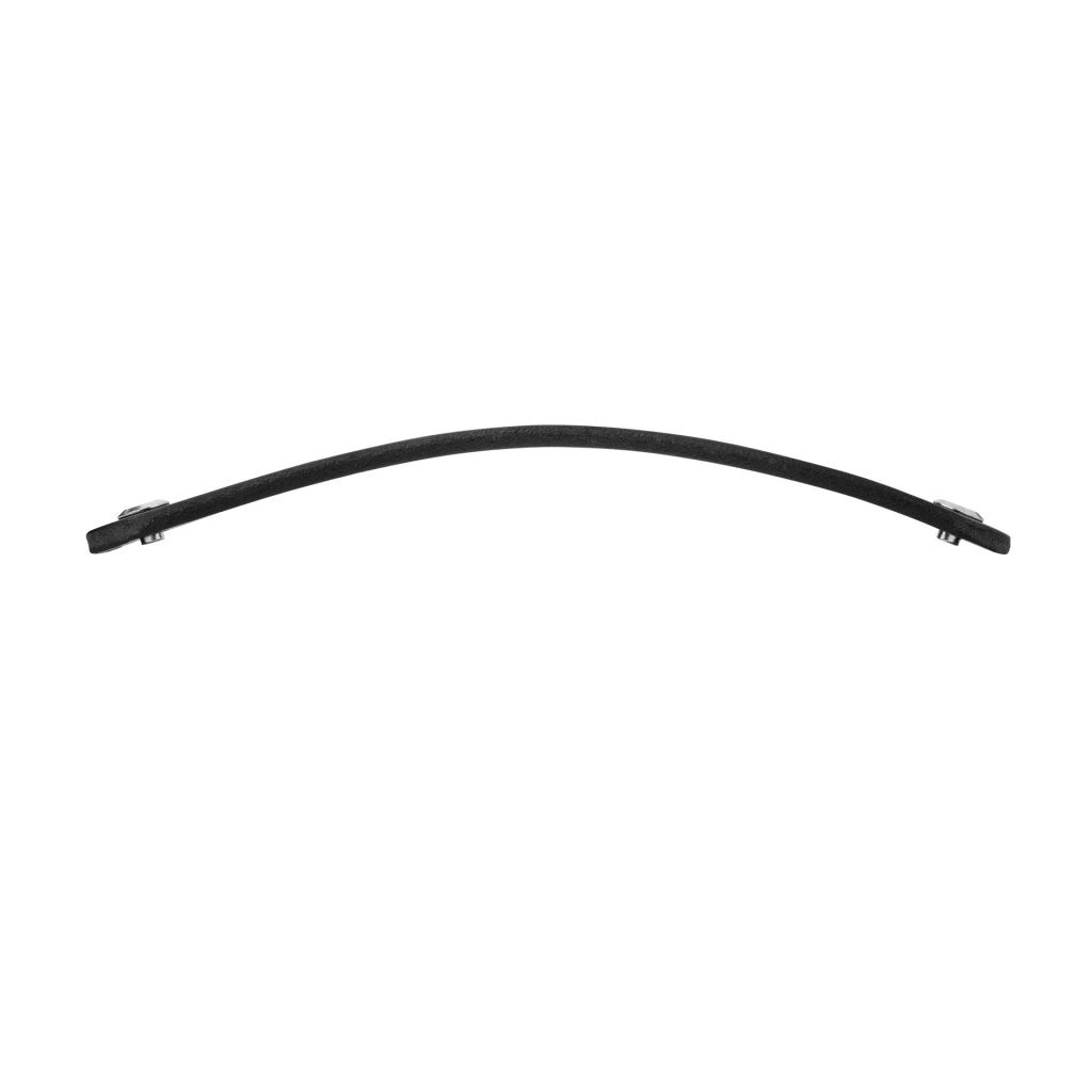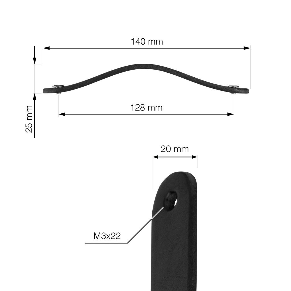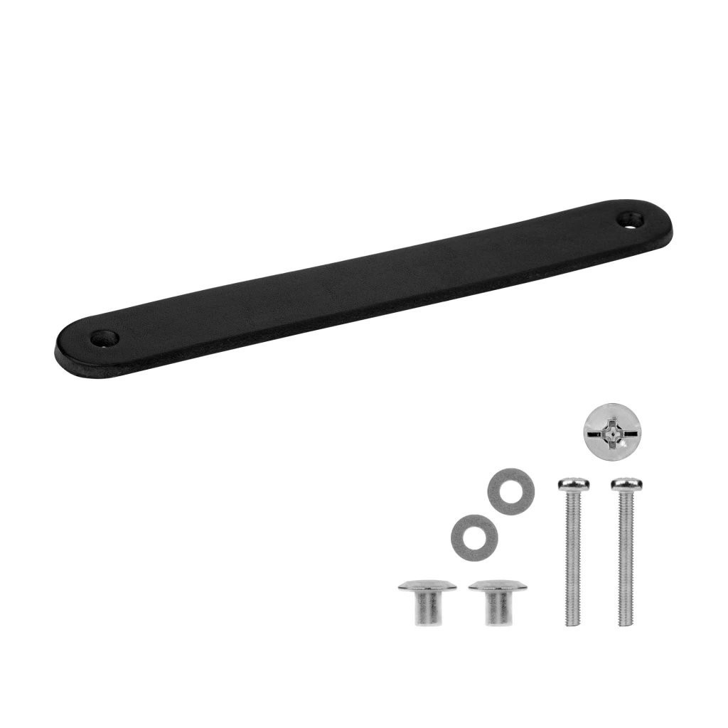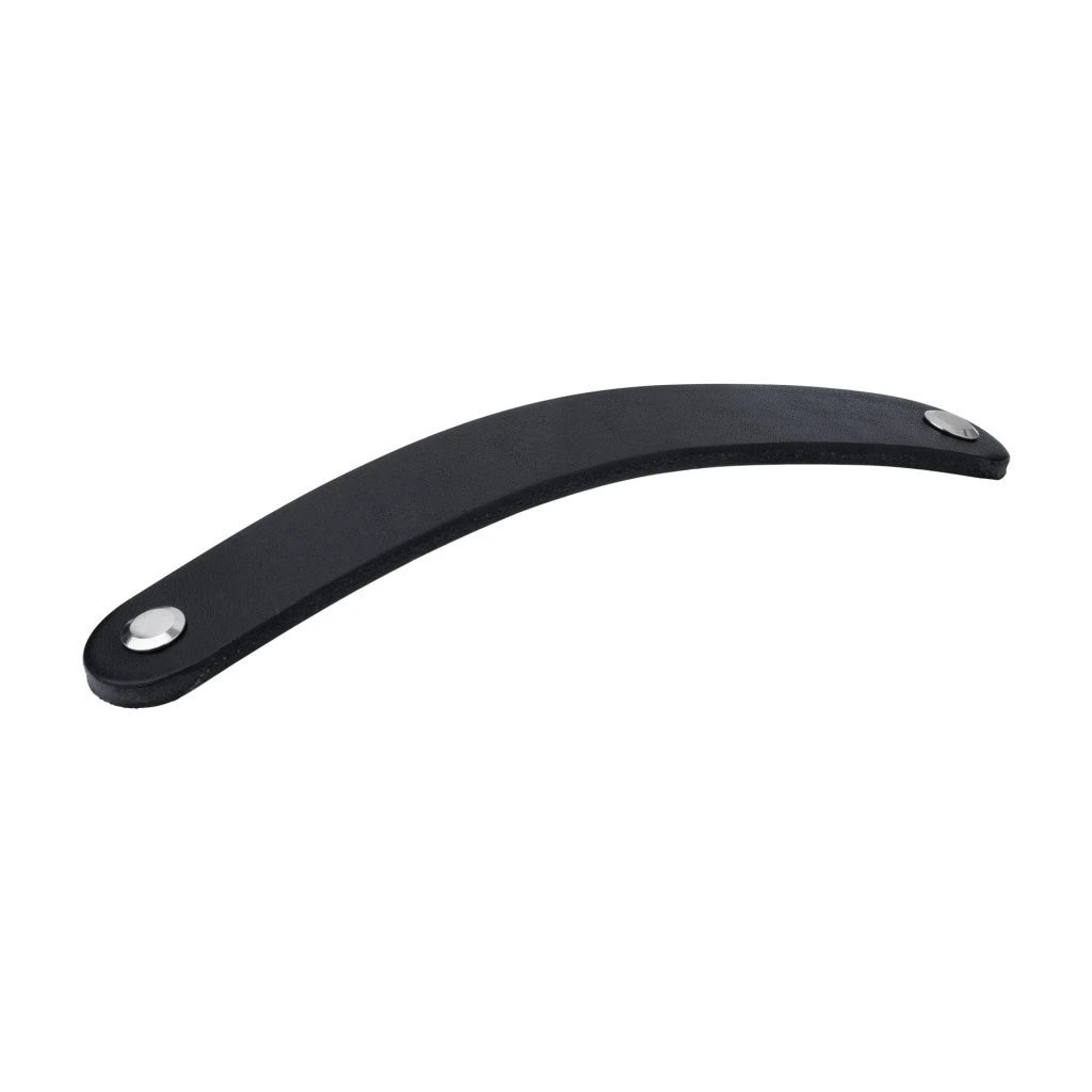 Modern Tolga bútorfogantyú, 128 mm-es tengelytávolsággal, fekete bőrből. A fogantyú hossza 140 mm, magassága 25 mm. Rögzítőcsavarral együtt.