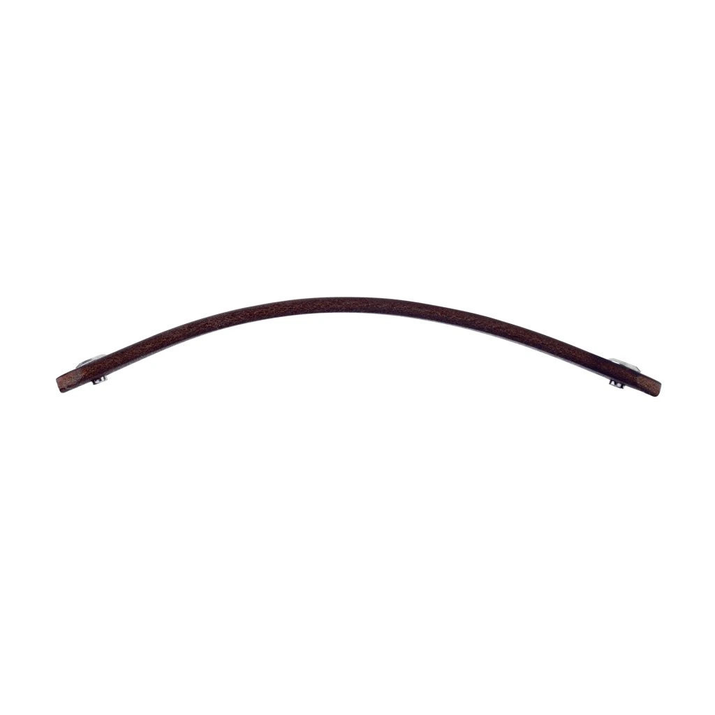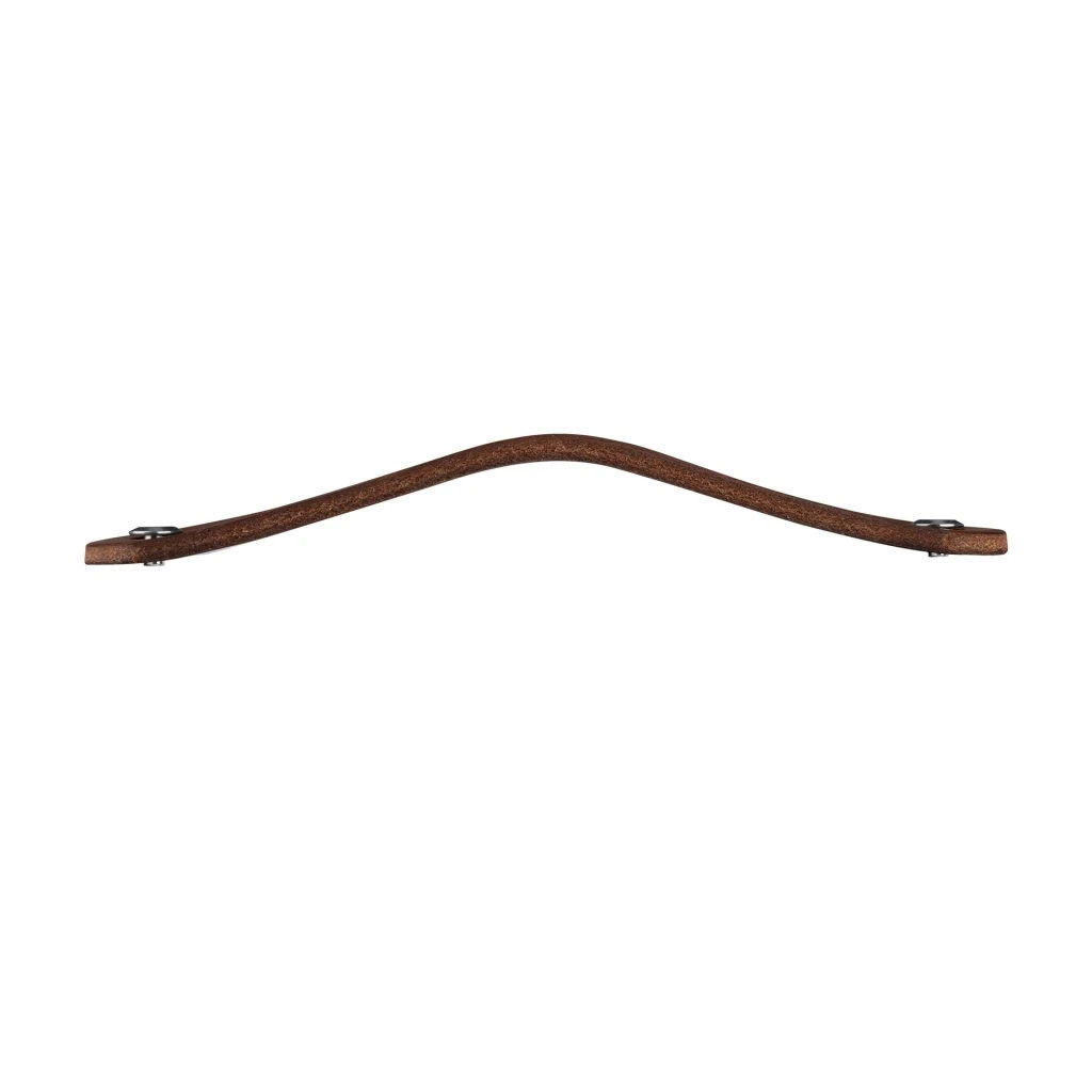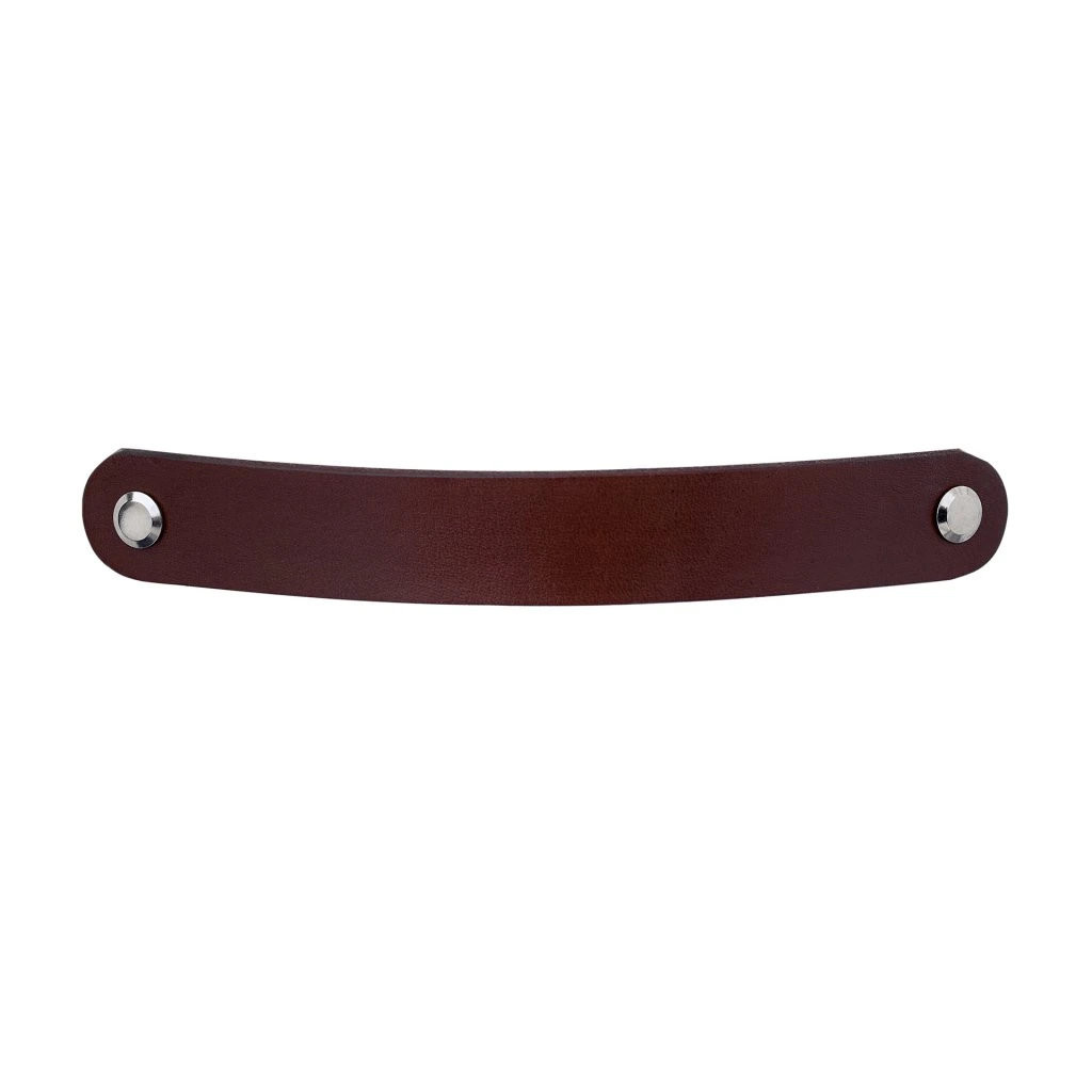 Modern Tolga bútorfogantyú sötétbarna bőrből, 128 mm-es tengelytávolsággal. A fogantyú hossza 140 mm, magassága 25 mm. Rögzítőcsavarral együtt.