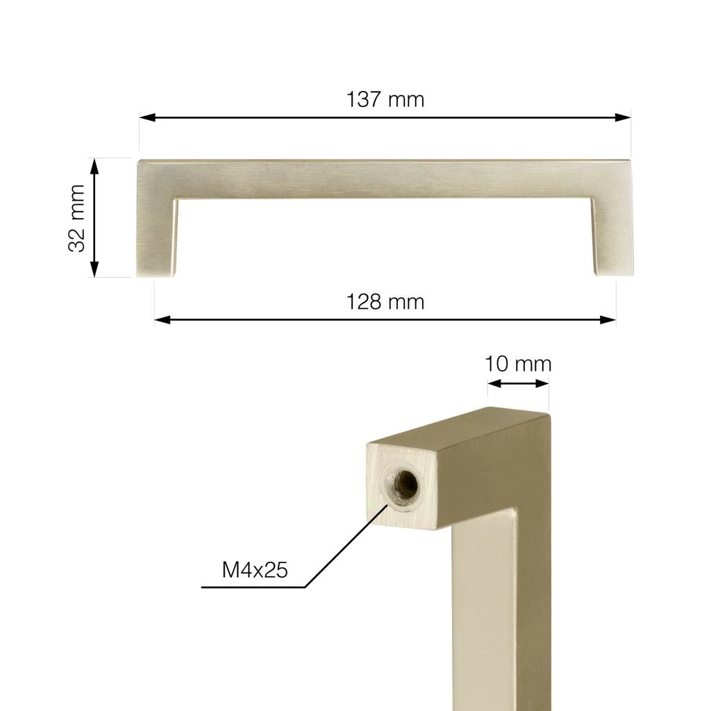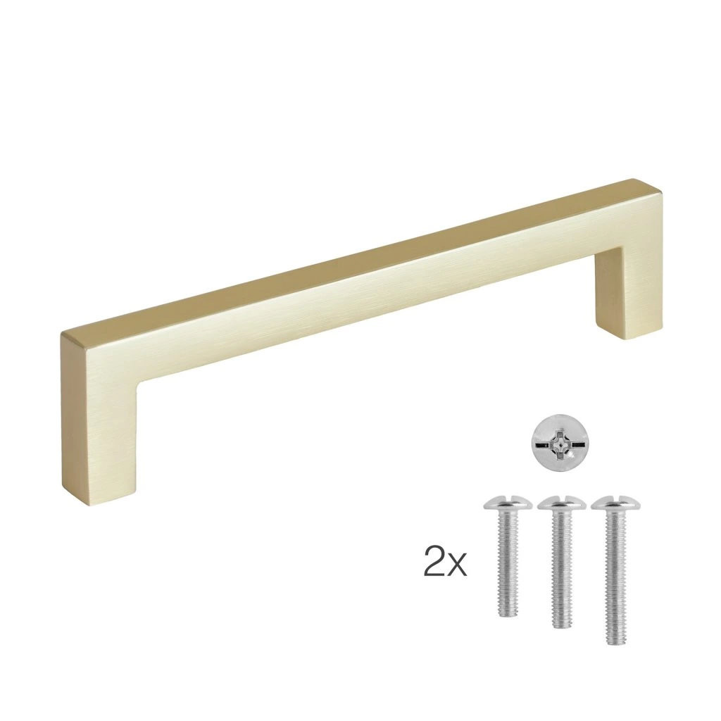 Modern Prisma bútorfogantyú 128 mm-es tengelytávolsággal és szálcsiszolt sárgaréz felülettel. Fogantyúhossz 137 mm és magasság 32 mm. Rögzítőcsavarokkal együtt.
