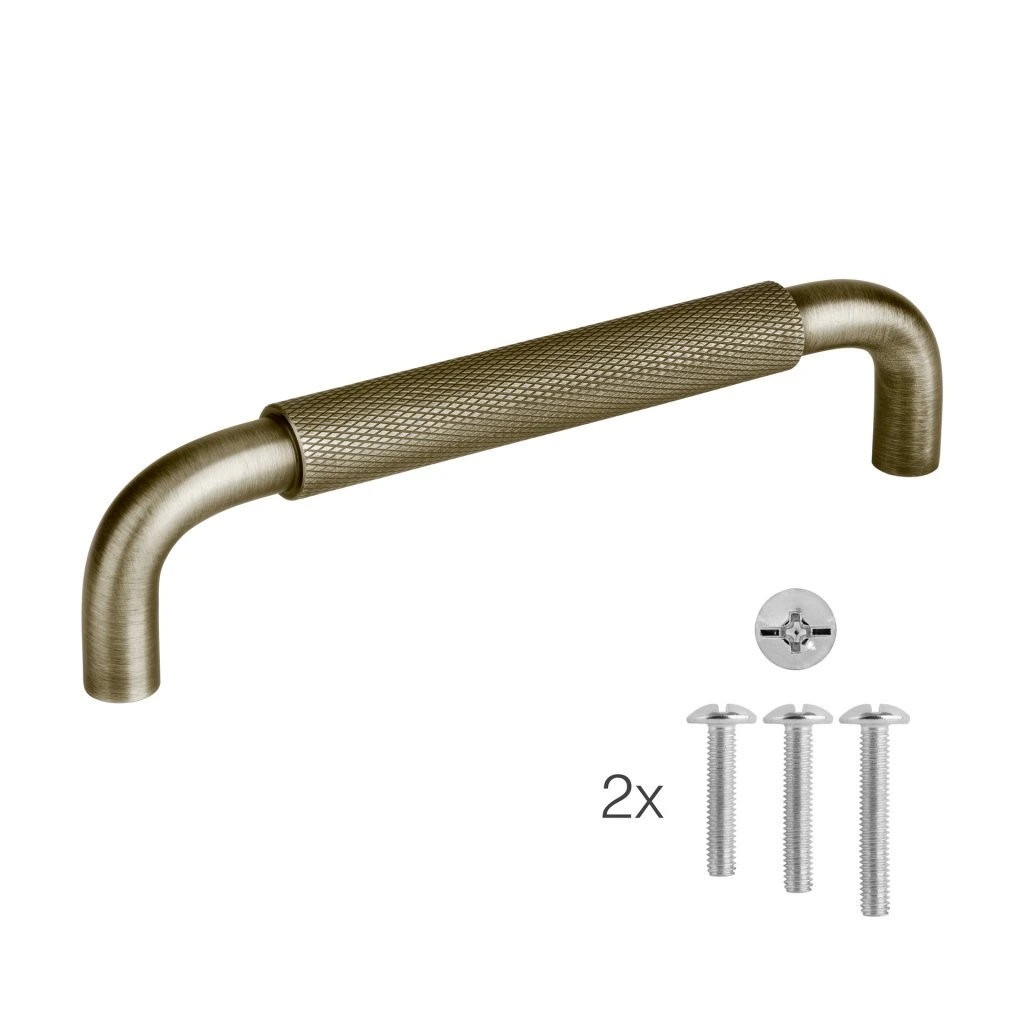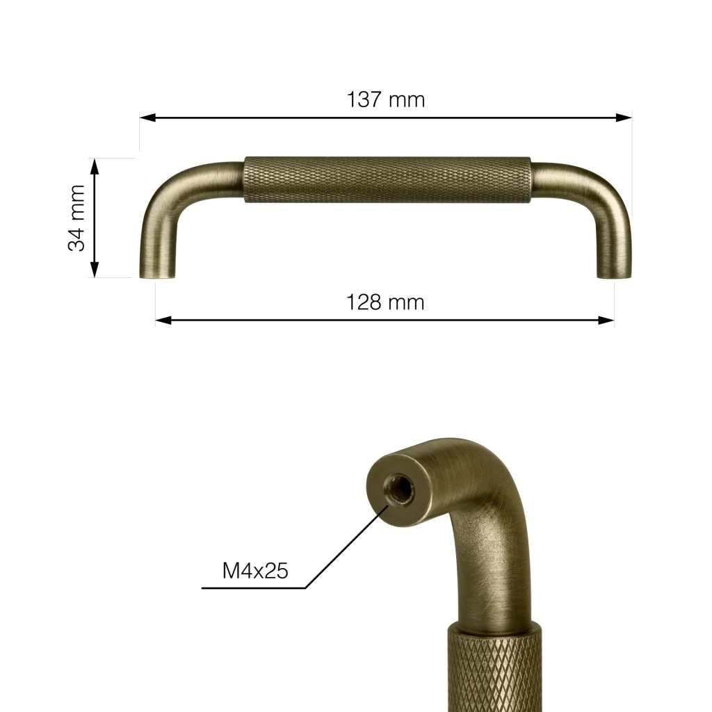 Modern Grave bútor fogantyú 128 mm-es tengelytávolsággal és antik bronz bevonattal. A fogantyú hossza 137 mm, magassága 34 mm. Rögzítőcsavarokkal együtt.