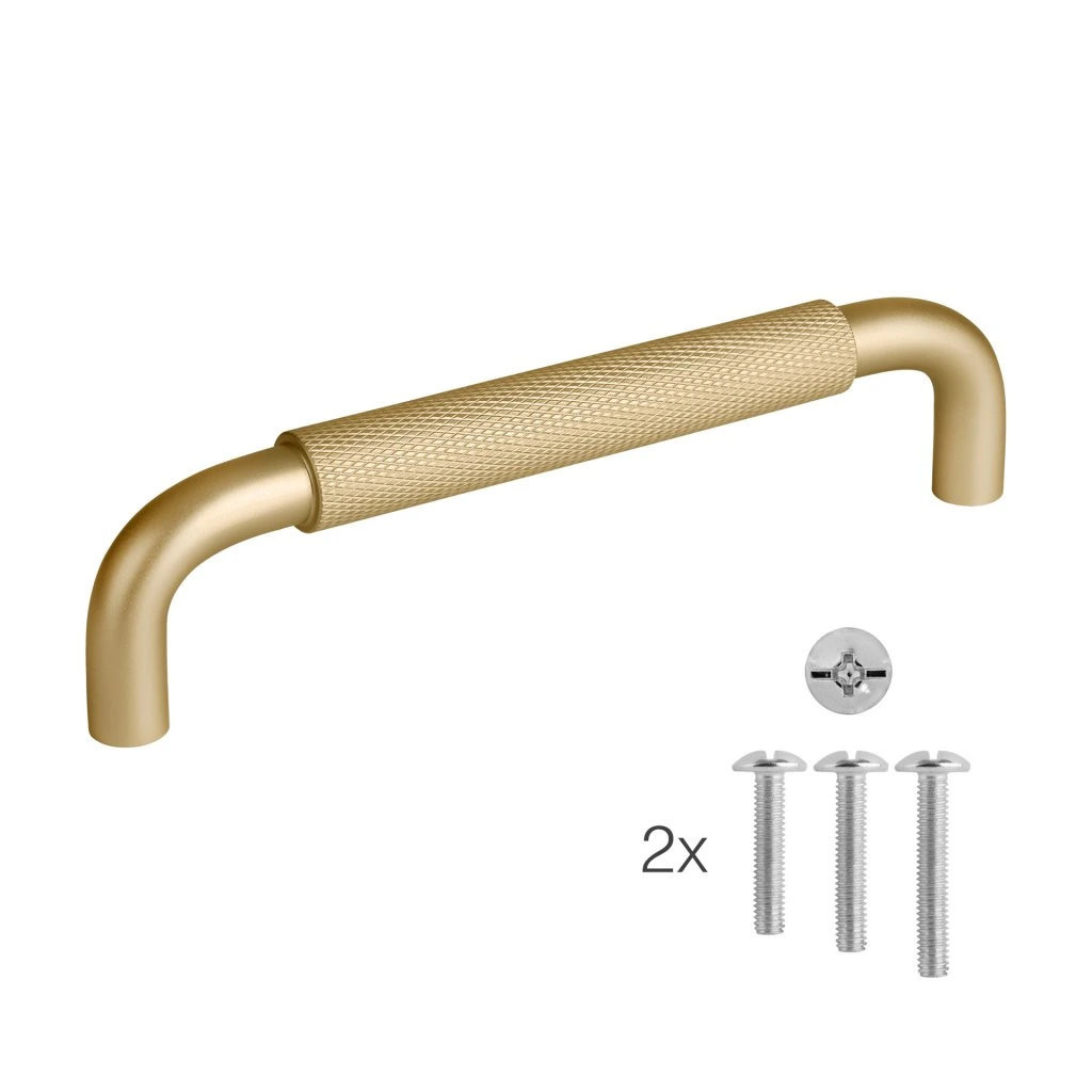 Modern bútorfogantyú Grave, 128 mm-es tengelytávolsággal és szálcsiszolt sárgaréz felülettel. A fogantyú hossza 137 mm, magassága 34 mm. Rögzítőcsavarokkal együtt.