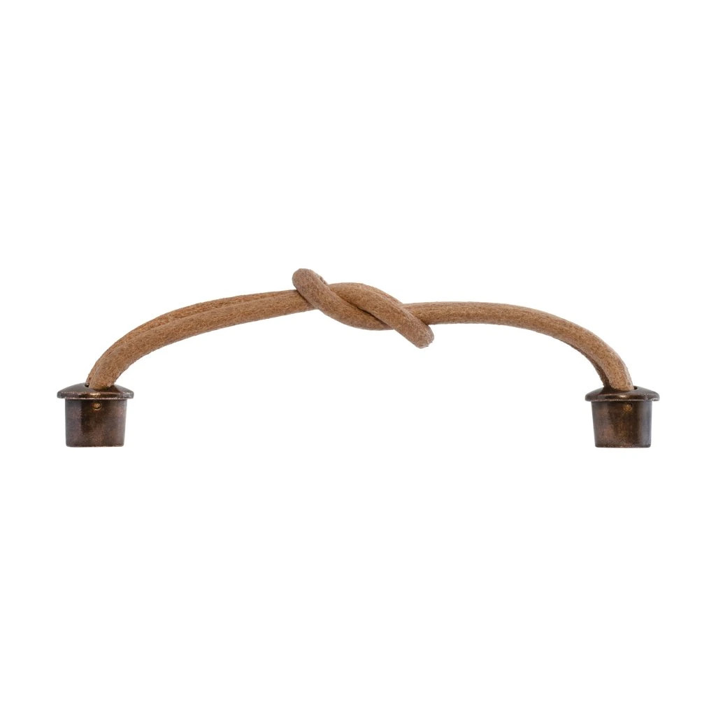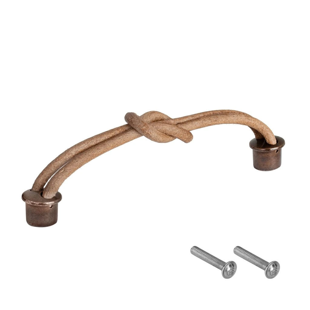 Modern bútorfogantyú Rimikni, 128 mm-es tengelytávolsággal, bőr/antik réz kivitelben. A fogantyú hossza 137 mm, magassága 33 mm. Rögzítőcsavarral együtt.